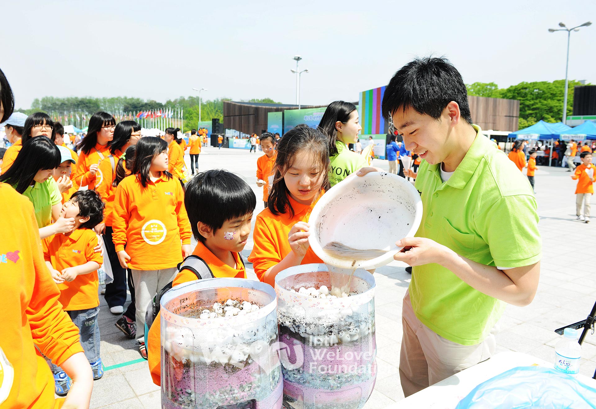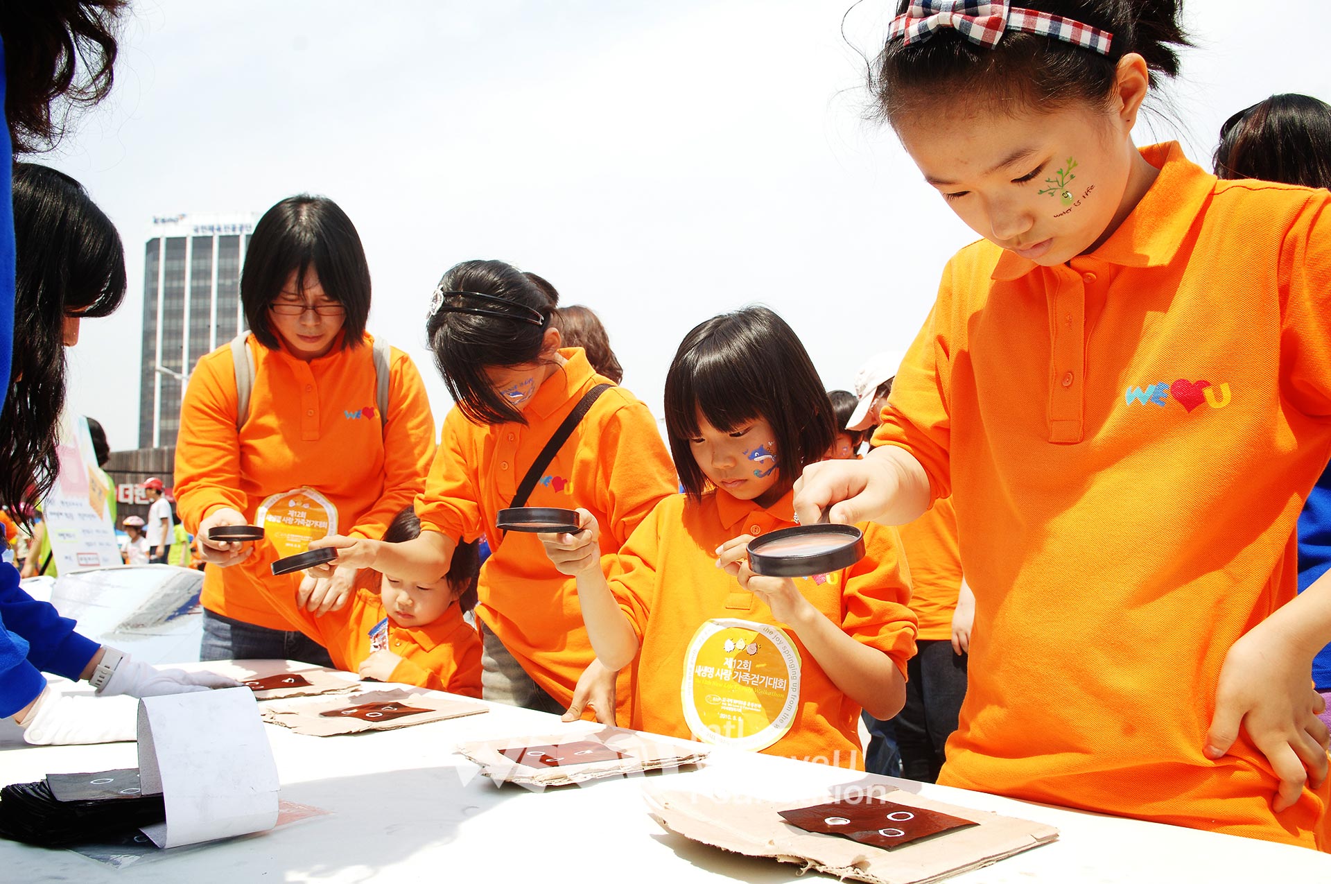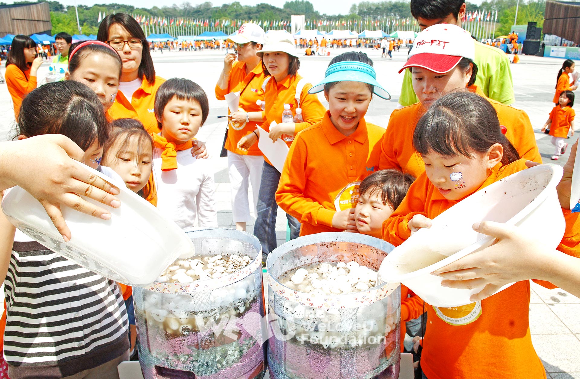 To help the children understand environmental problems, in the square many different events were prepared such as Water Photo Gallery,Energy Save Theme Park, Messages of Hope, Signing with the Palms of the Hands, Drawing Pictures of Nature, Making Slogans, Photo Contest,etc. At the booth which was set up to experience a water pump, many children gathered and touched the pumps with curious eyes, and clean water kept flowing out on the edges of their children’s fingers. The notice board was filled with memos like “My friends in Africa,cheer up!” ” I will try to save water now,” and with signatures of the palms of the hands; they were showing the beautiful future that our children are going to make.