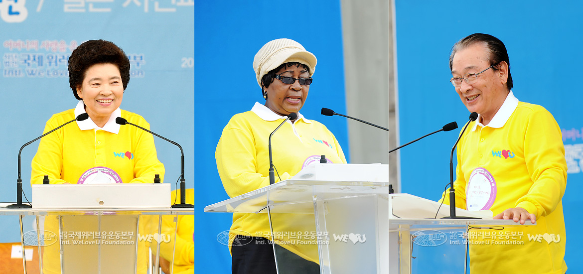 Before the walkathon, there was a celebration on the bandstand in the park. Chairwoman Zahng Gil-jah hoped that the walkathon gave an opportunity to look around our families and neighbors through “walking” that makes people get along with one another without competition and have a sincere talk so that they can be healthy both physically and spiritually. In her welcoming message, she also said that their footsteps would give great energy to our global neighbors who lost peace of mind, being driven to despair due to natural disasters.