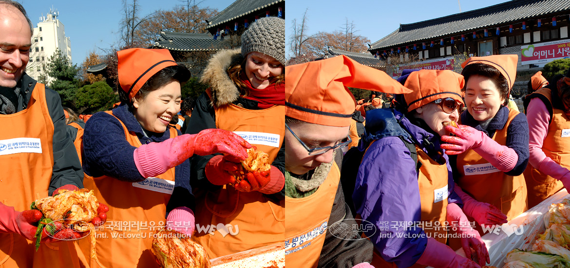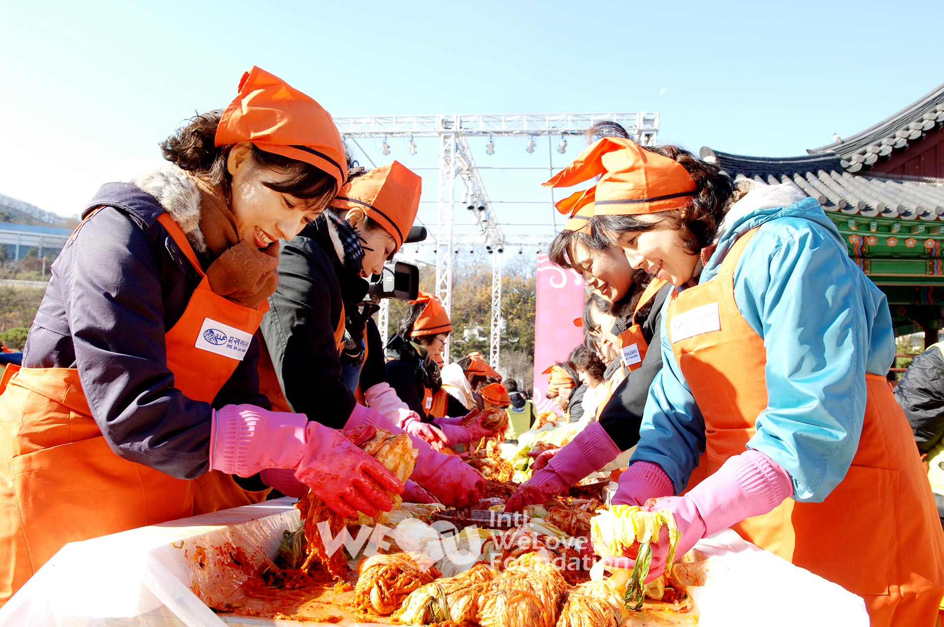 The temperature dropped to -10℃ [14℉], but Zahng Gil-jah, Chairwoman of the IWF, and 170 members’ love for neighbors even calmed down the piercing wind. In this festival the wives of foreign diplomats in Korea participated. They had a wonderful time, experiencing Korean culture. The vocalist Namgung Ok-bun and the actress Kim Ji-yu also attended the festival as the IWF PR ambassadors. Chairwoman Zahng said, “I hope our neighbors in need will enjoy this kimch made with true love, and have warm winter.”
