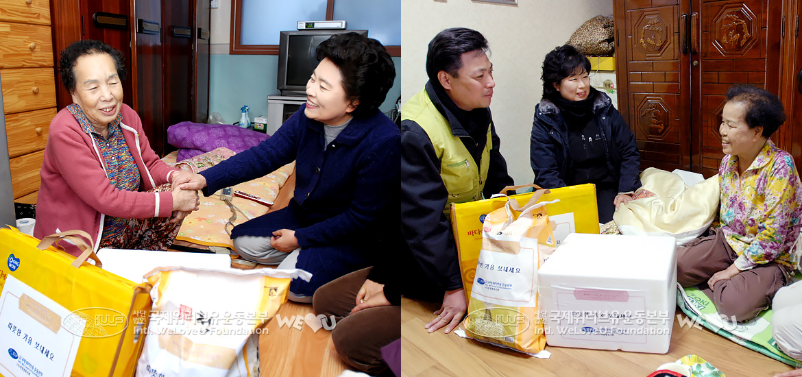 Chairwoman Zahng Gil-jah together with Kim Ji-yu visited senior citizens who were living alone and presented them rice, kimch and some other gifts on behalf of the IWF members who wanted to share love with their neighbors, and wished them good health and a warm winter. Sim Bok-seob, Manager of Service Link in Jung-gu, Seoul, showed his appreciation to the IWF’s volunteer work for the residents in his district, saying, “I’m happy that our neighbors are able to spend this winter without worrying about side dish thanks to the kimchi which is the main side dish during winter. I feel true love from the IWF members who are making efforts to live together rather than alone.”