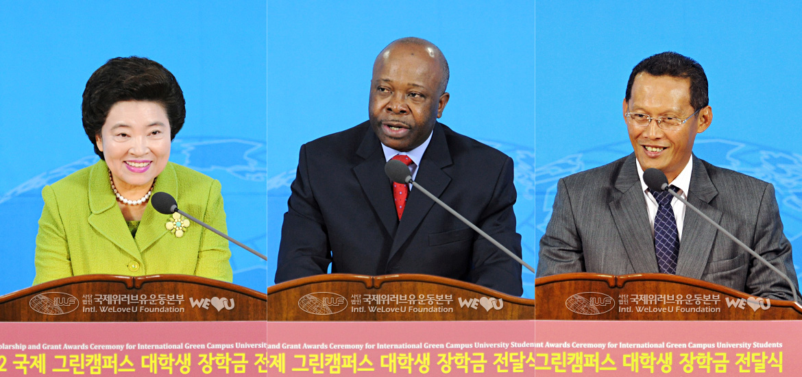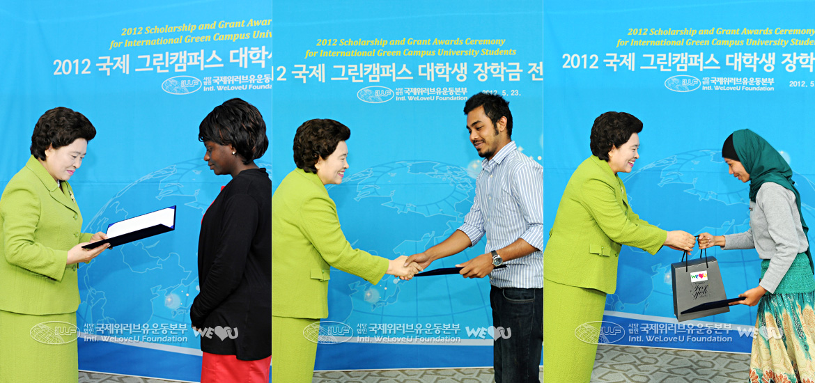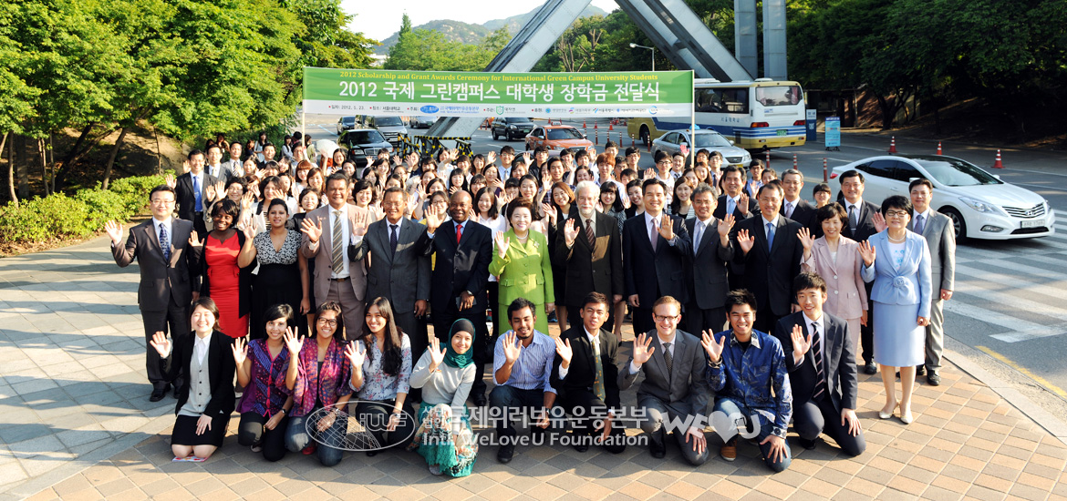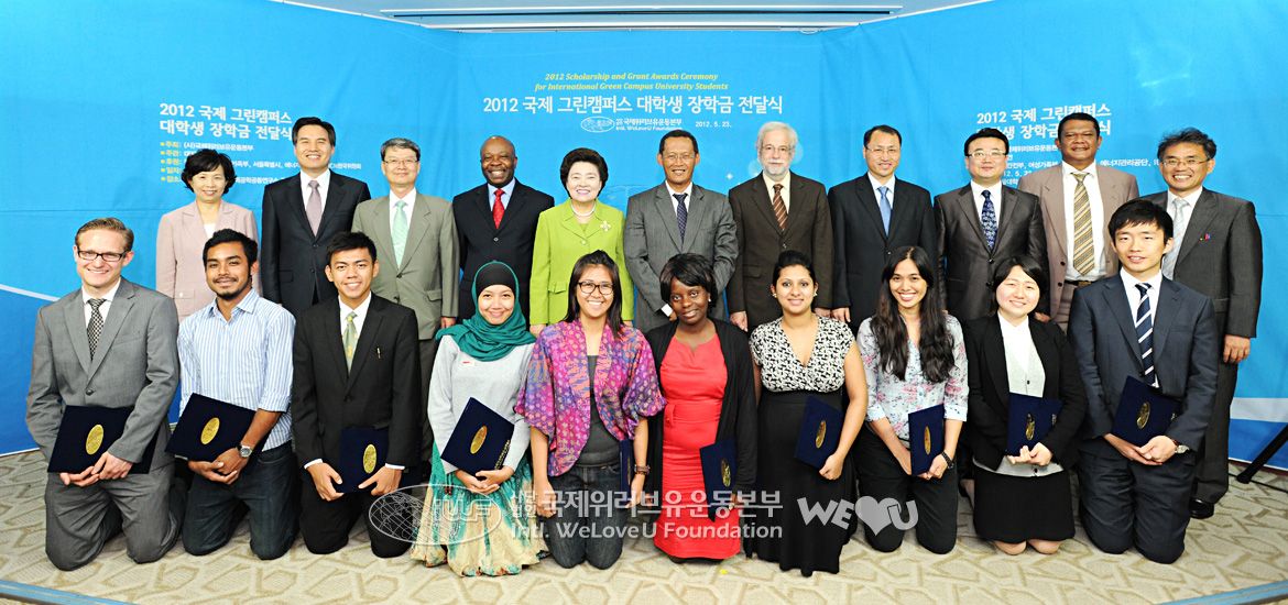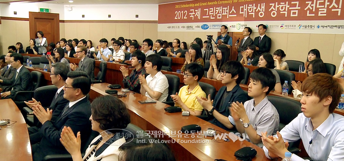 Around 3 p.m. on May 23, the “2012 Scholarship and Grant Awards Ceremony for International Green Campus University Students” was held by the Intl. WeLoveU Foundation at the International Conference Hall of Basic Electric Institute, Seoul National University. To encourage and support university students’ environmental activities, the Foundation gave scholarship to the university student environmentalists who are actively coping with the environmental problems while studying hard. Embassies of several countries and global environmental organizations also supported this.