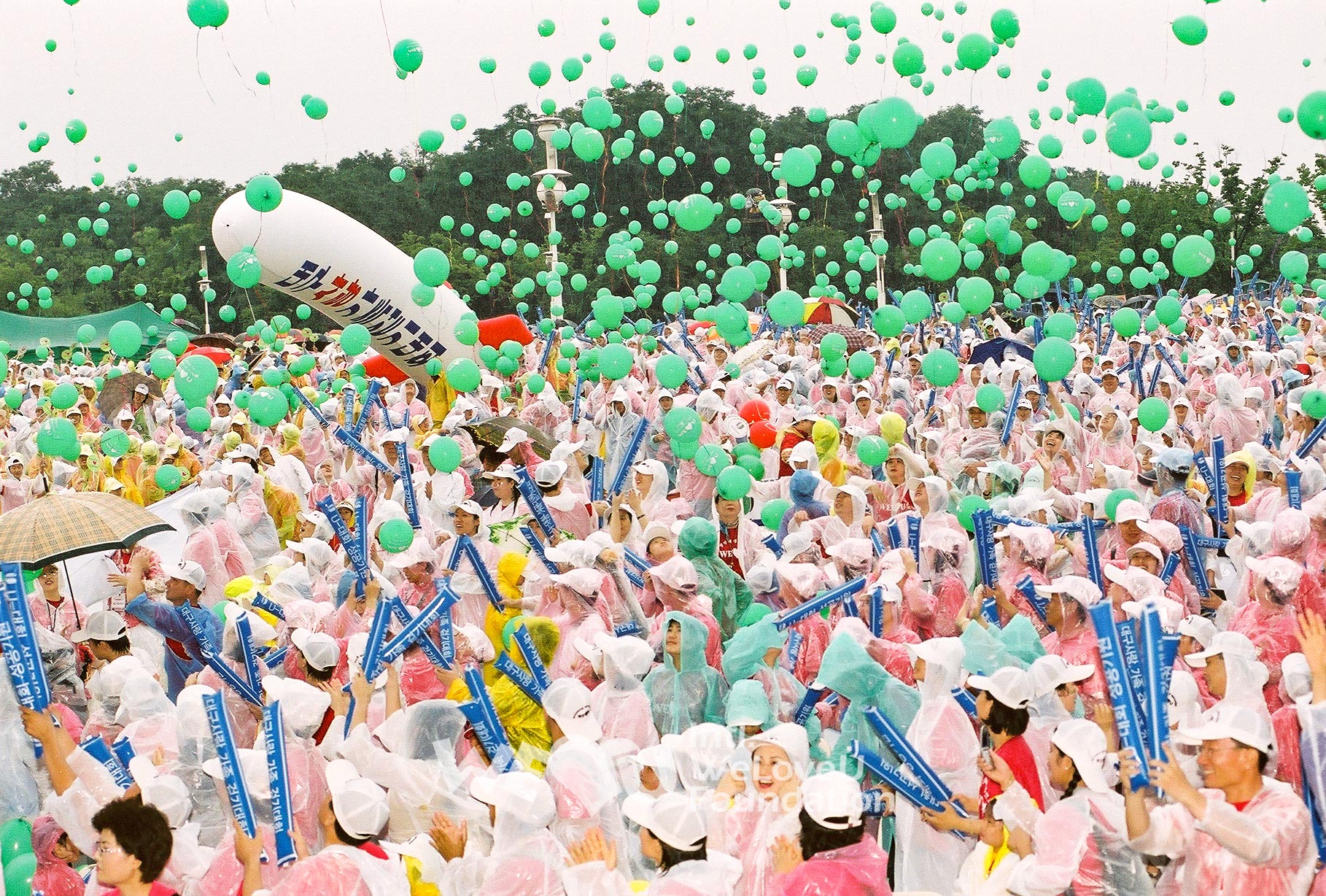 Although the rain poured down, the walkathon went on as it had been scheduled. The participants who wore raincoats over their pink T-shirts kept walking briskly. Fathers and mothers who wheeled baby carriages, an elderly lady who painted her face with Taegeukgi (the national flag of Korea), and even a disabled member in his wheelchair joined the walkathon. People said that all the Duryu Park was filled with angels in raincoats.