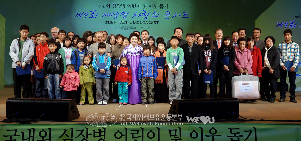 On November 9, 2008, IWF held the 9th New Life Concert to help children suffering from disease and poverty at the Jamsil Student Gymnasium in Seoul. It was sponsored by the Ministry for Health, Welfare and Family Affairs, Seoul City, Korea Youth Service Center, and Sejong General Hospital. Many celebrities attended the concert with over 10,000 IWF members: Zahng Gil-jah the IWF Chairwoman, Lee Kang-min the IWF Chief Director, Lee Soon-jae the IWF Sponsor Chairman, Kim Gu-seob the Head of Korea Institute for Defense Analyses, Yi Bae-keun the Chief Director of Korea Youth Service Center, Lydie Bertrand the French Embassy Information Officer, Harry A.C. van Woerden the Head of Netherlands Foreign Investment Agency in Korea, including the IWF PR ambassadors Kim Ji-yu (actress), Lee Seung-hun (vocalist), Kim Bo-seong (actor), and Han Wang-young (climber).
