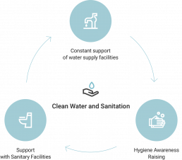 Water is life. Millions of people die from diseases associated with inadequate water supply, sanitation, and hygiene. We make efforts to preventing water-borne diseases caused by contaminated water and create a clean environment by installing water pumps, water tanks,and water supply systems in Asian and African countries facing water shortages.