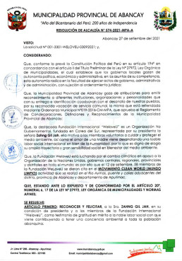 Article 1 – We express our gratitude to and congratulate Chairwoman Zahng Gil-jah, and the members of the Intl. WeLoveU Foundation for helping the citizens of Abancay City raise their environmental awareness through noble social work.
