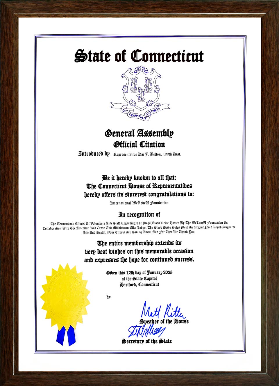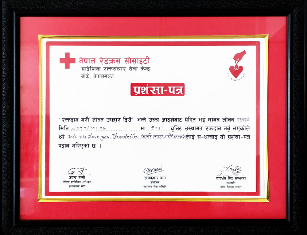 In recognition of enthusiasm of your unbelievable support for Blood Drive Campaign to save the Human Life and Cleaning Campaign to save the environment with the Hearth of Mother through the organization, Intl. WeLoveU Foundation. We are ecstatic for your kindness to save the environment and the human life.