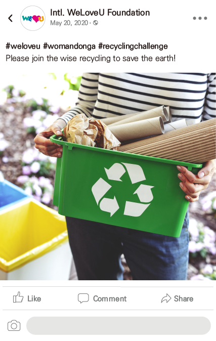 For the establishment of a desirable recycling culture and recycling of resources, the WeLoveU Foundation and WomanDongA carry out a global campaign called #recyclingchallenge. “Please express your willingness to save the earth and the environment through #recyclingchallenge!”