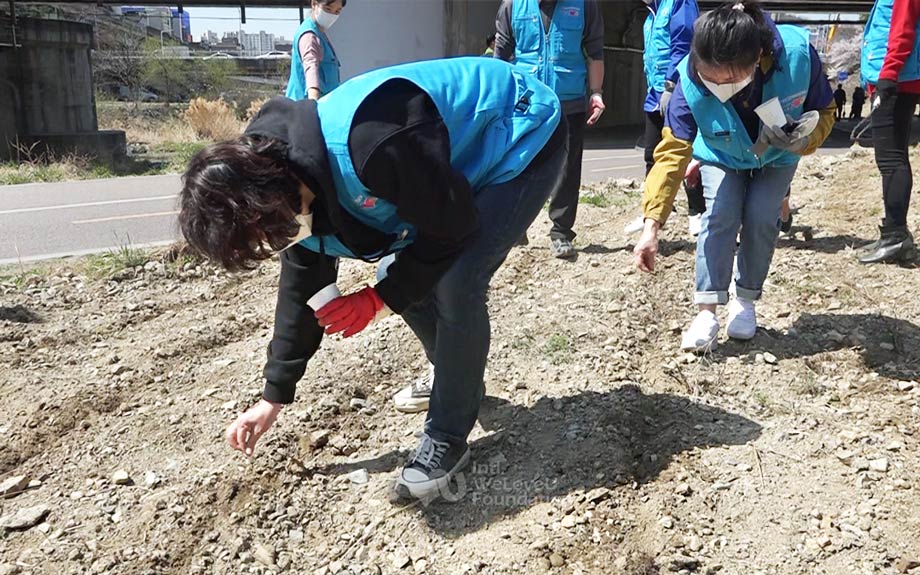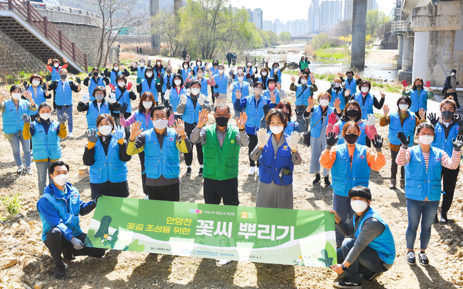 On April 7, the Intl. WeLoveU Foundation Anyang Chapter members, in response to a request from the Anyang 2-dong Administrative Welfare Center, began beautifying the Anyangcheon Stream walking path. Cooperating with local social organizations, they planted cosmos, poppies, hibiscus, and sunflower seeds over approximately 661.2 ㎡.