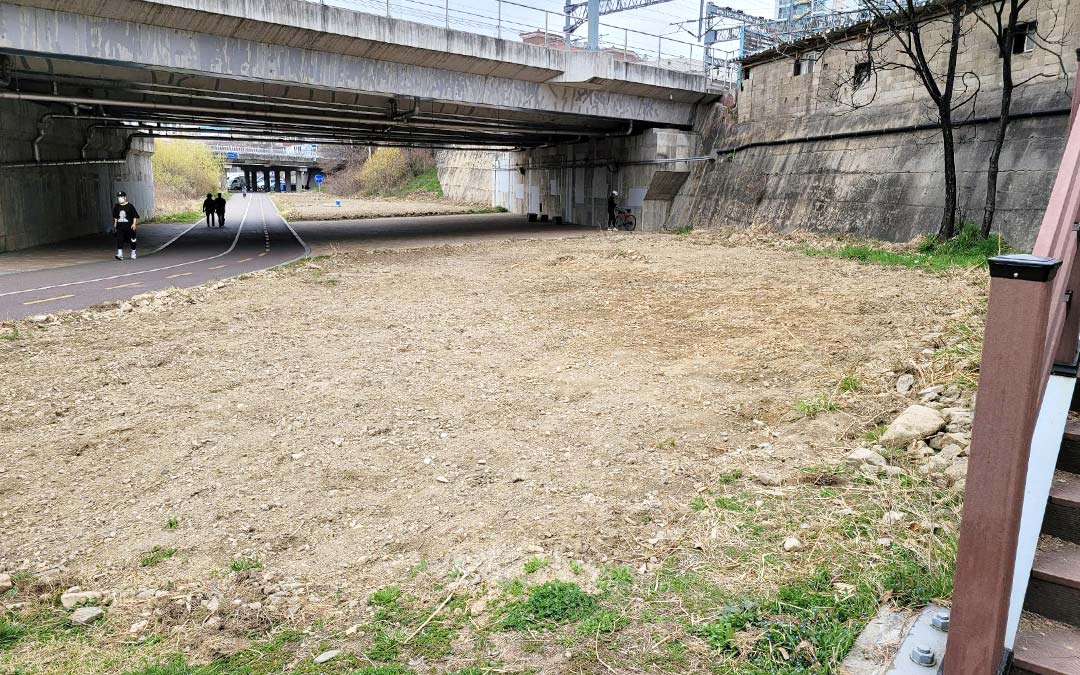 On a sunny spring day, WeLoveU Anyang Chapter members gathered at a vacant lot under the bridge where the train passes, equipped with hoes and flower shovels. Unlike the surrounding area, where Anyangcheon Stream flows gently and lush greenery abounds, this spot stands out with its bare, dry soil.