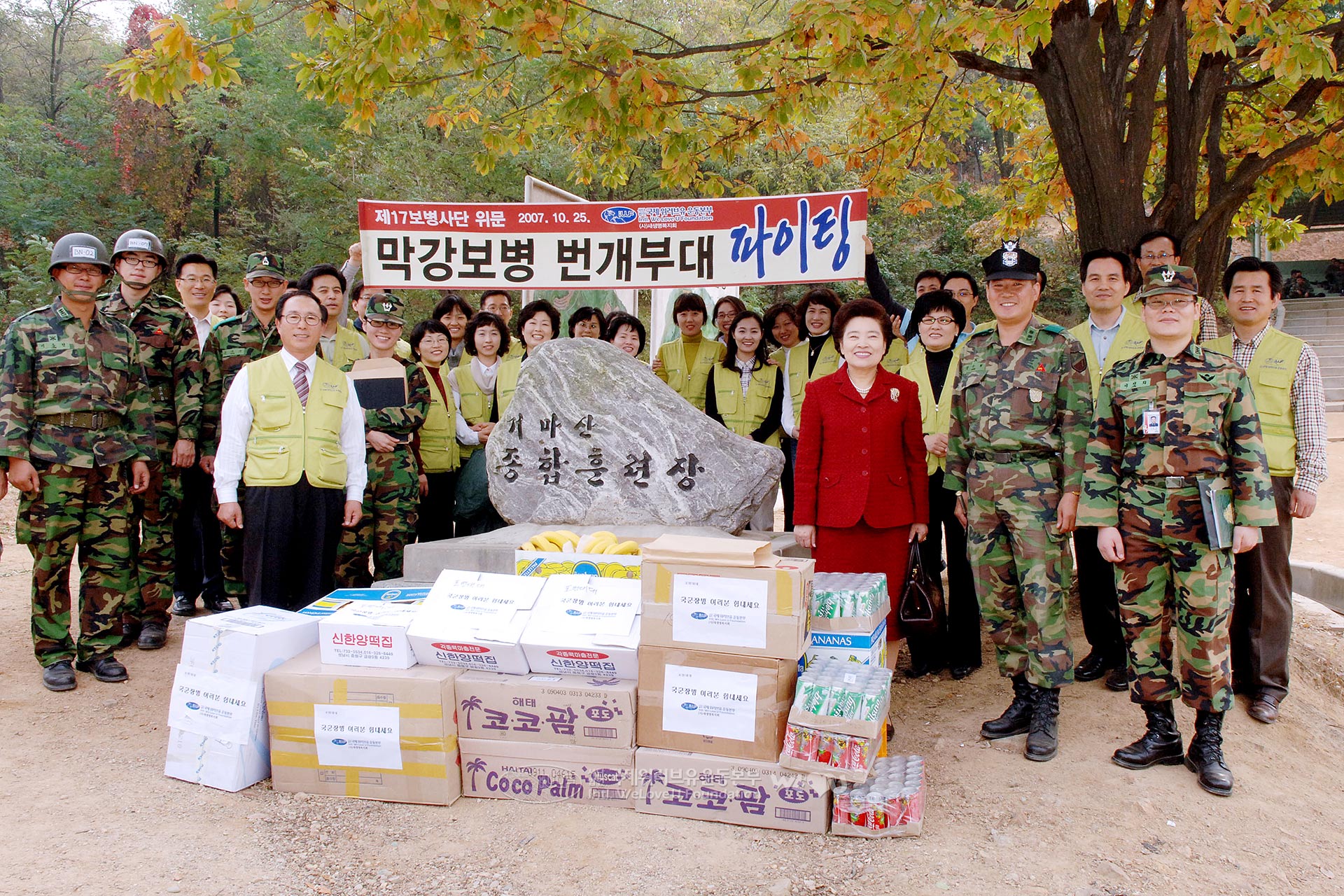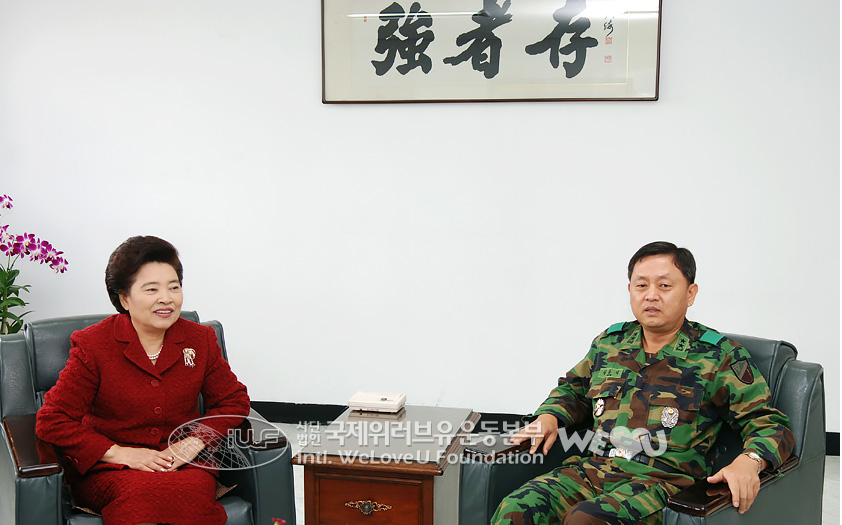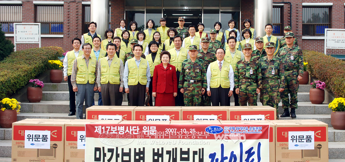 To give thanks and comfort to them for their efforts,the International WeLoveU Foundaion Chairwoman Zahng Gil-jah and about 40 members visited the 17th infantry division on October 25. At the entrance, a divisional commander and many soldiers welcomed the Foundaiton members with cheerful melidies performed by a military band.