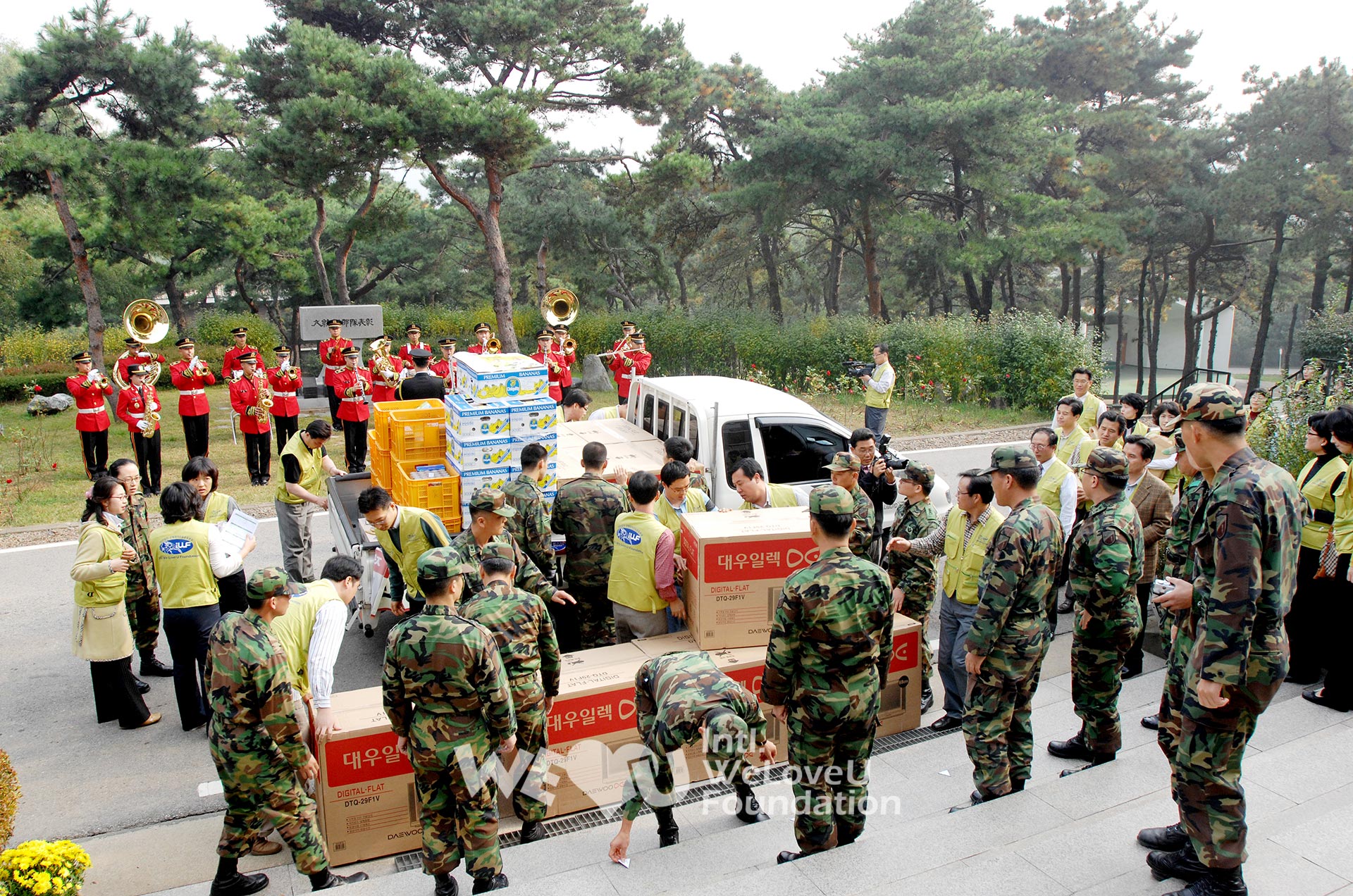 Chairwoman Zanhng Gil-jah presented articles of comfort and expressed her gratitude,saying,”You always make every effort to defend our country day and night,summer and winter. I always feel grateful for you.” This day, the Foundation members donated ten large-scale flat TVs and served about a thousand soldiers with rice cakes,fried chickens, fruits,beverages. Commanding General of Division, Sim Yong-sik said, “I’m sure we, soldiers, can make more efforts to defend our nation, being warmed by your wholeheartedly prepared food. I expect you to visit us often and give us comfort.” Military officers, who knew well the soldiers’effort and difficulties, also said, “Although military facilities were modernized, it was not easy to change old TVs in the quarters. The morale of our soldiers may be improved by your concern for their welfare.”