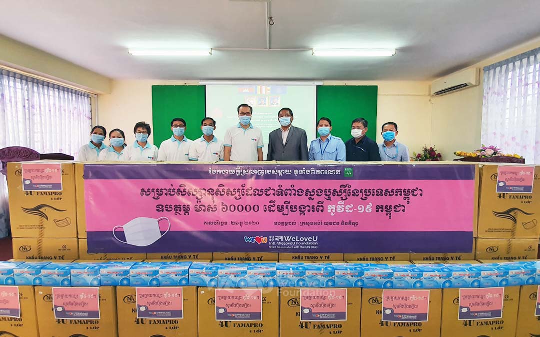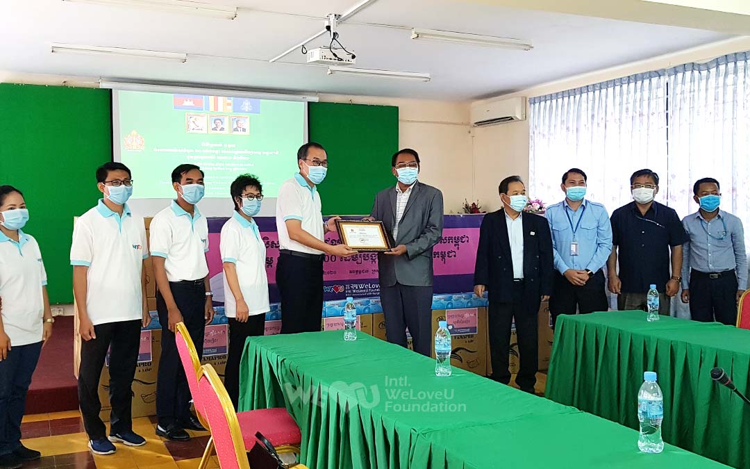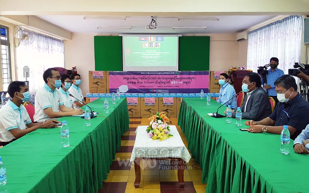 On December 21 at 3 p.m., the Intl. WeLoveU Foundation (hereinafter the WeLoveU) donated 60,000 face masks in the conference room of the Cambodia Olympic Stadium. The officials from the Ministry of Education, Youth and Sports (hereinafter the Ministry of Education) and the WeLoveU members sat face to face at a table covered with dark green tablecloths for the ceremony.