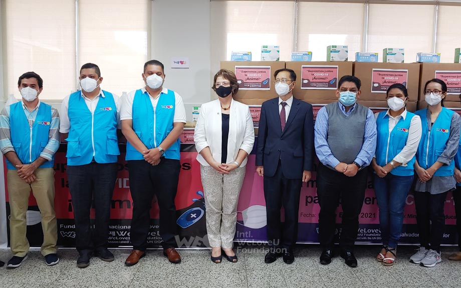 On January 7, Intl. WeLoveU Foundation donated 23,000 face masks and 40 bottles of 3.75 liters [1 gallon] of hand sanitizer to the Central Regional Health Directorate located in Santa Tecla, La Libertad, El Salvador. Hearing that the medical staff at public health centers who work hard at the forefront of the pandemic are having difficulties due to a shortage of preventive supplies, the WeLoveU immediately set out to provide help. A few days later, on the 11th, they delivered 30,000 face masks and 100 bottles of hand sanitizer to the Ministry of Education of El Salvador to prevent COVID-19 among students and teachers in public schools.