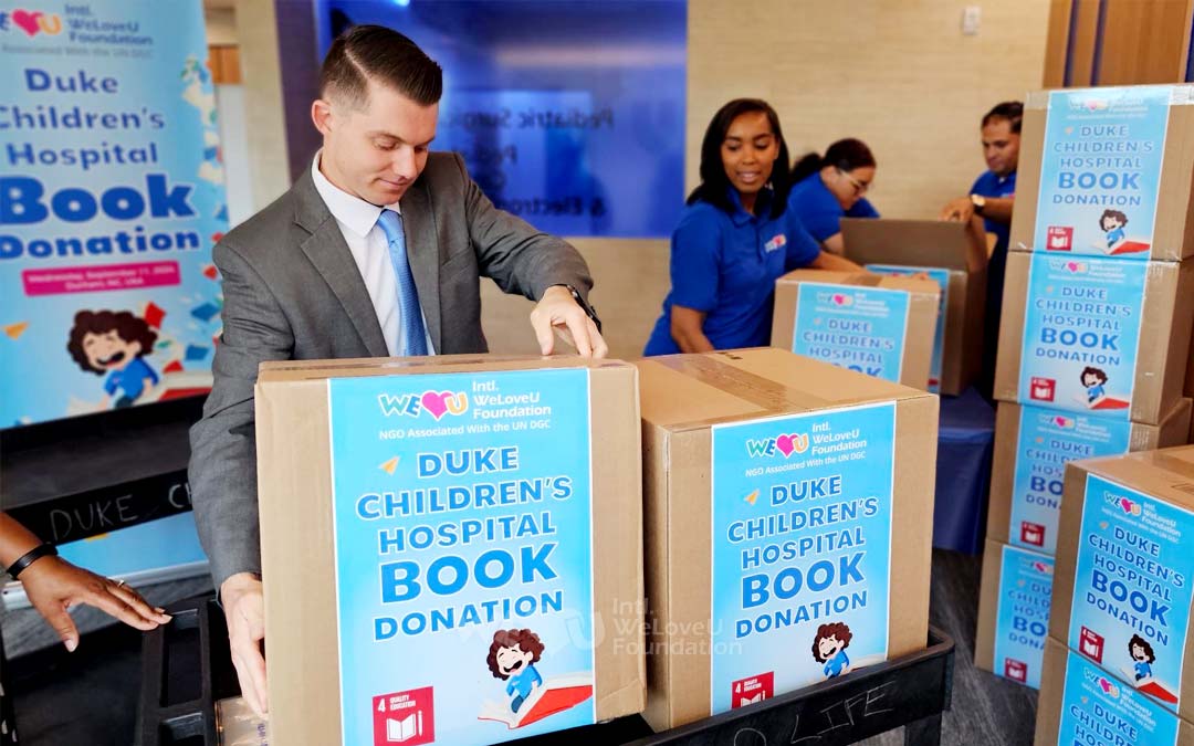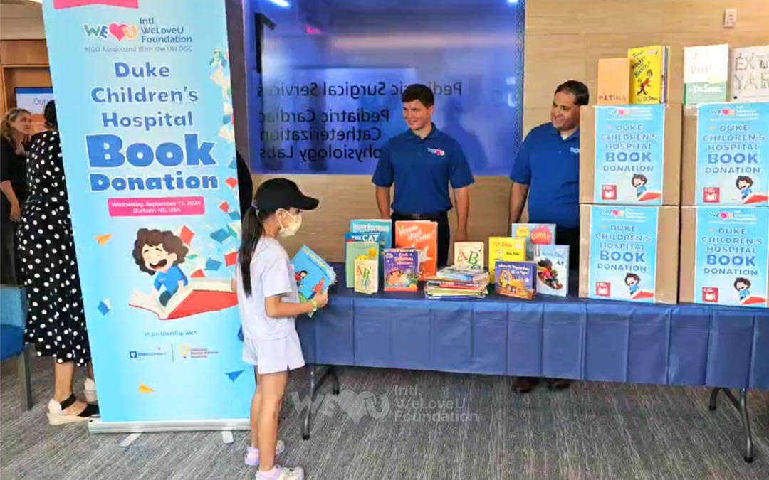 On September 11, 2024, a special gift arrived at Duke Children’s Hospital in Durham, NC.—children’s books prepared by the Intl. WeLoveU Foundation. To bring warmth and hope to children staying in the hospital, WeLoveU members and local citizens joined forces to donate 350 books.