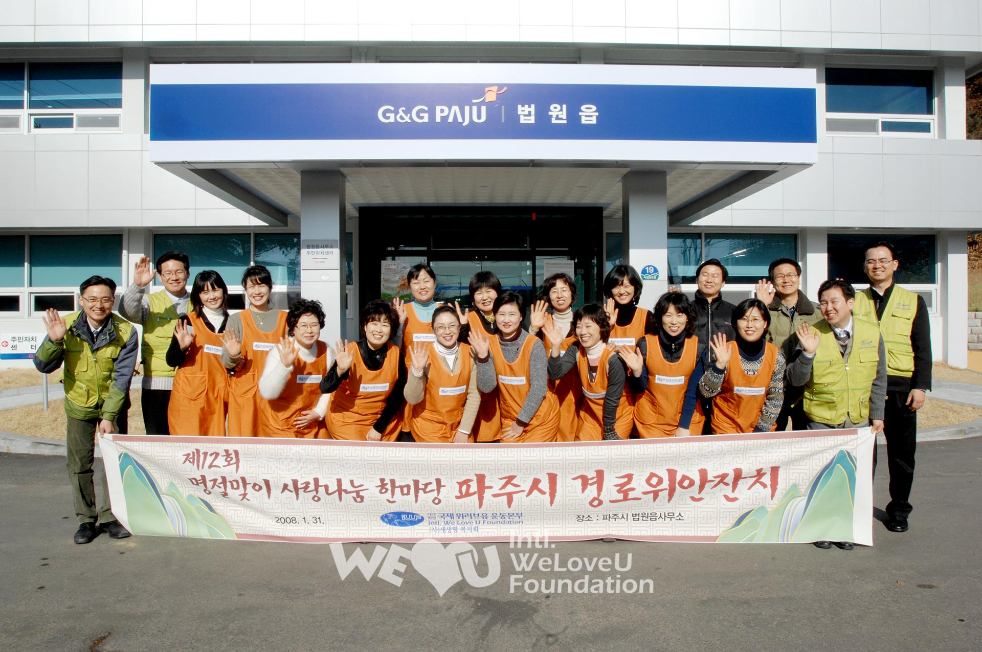 Este es el 12.º Evento para Compartir Amor Saludando el Feriado Nacional. El 31 de enero, a pocos días del Día de Año Nuevo Lunar, los miembros de la Fundación Internacional WeLoveU visitaron Beobwon-eup, una hermosa región rural de la ciudad de Paju, provincia de Gyeonggi, donde se cultivan productos orgánicos. Esta región está estrechamente relacionada con la fundación; a través del último Concierto Nueva Vida que ayudó a los niños que sufren de enfermedades cardíacas y enfermedades raras, además de trabajadores extranjeros heridos, la fundación donó fondos para los gastos médicos de los niños desafortunados que viven en esta región. Esta vez, los miembros de la fundación llevaron a cabo una fiesta de consuelo para cien ancianos que viven solos o permanecen en instituciones, en la sala de conferencias multipropósitos del segundo piso de la oficina de Beobwon-eup.