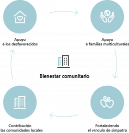 Nos esforzamos por el bienestar de las personas desfavorecidas, como los niños, las personas mayores, las mujeres y los discapacitados. Compartimos el amor familiar con ellos apoyando a las instituciones de asistencia social con suministros y servicios voluntarios, y promovemos la comunicación y la armonía entre los miembros de la comunidad ayudando a los agricultores, realizando conciertos de caridad y ofreciéndonos como alentadores voluntarios de juegos deportivos nacionales o internacionales.