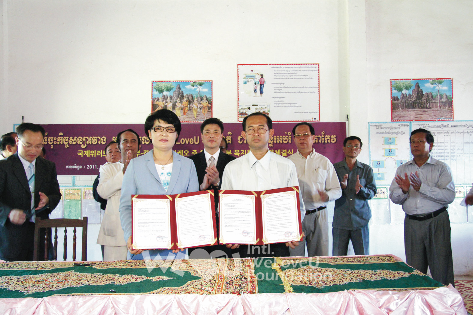 El 21 de agosto, la junta directiva de la Fundación Internacional WeLoveU, el Ministro de Correos y Telecomunicaciones de Camboya y funcionarios de la Oficina de Educación de Takeo asistieron a la ceremonia de firma del memorando de entendimiento celebrada en la escuela primaria Sokahn Potsor, Takeo. En esta ceremonia, el Ministro de Correos y Comunicaciones, So Khun, entregó la Orden Real de Monisaraphon a la Fundación Internacional WeLoveU. La medalla fue otorgada a la Presidenta Honoraria Zahng Gil-jah por su contribución a la instalación de bombas de agua, donación de materiales educativos a las escuelas de Camboya y por la reparación de viviendas de ciudadanos necesitados. Después de la ceremonia, se firmó un memorando de entendimiento entre la fundación y el Departamento de Educación, Juventud y Deportes de la Provincia de Takeo, Camboya.