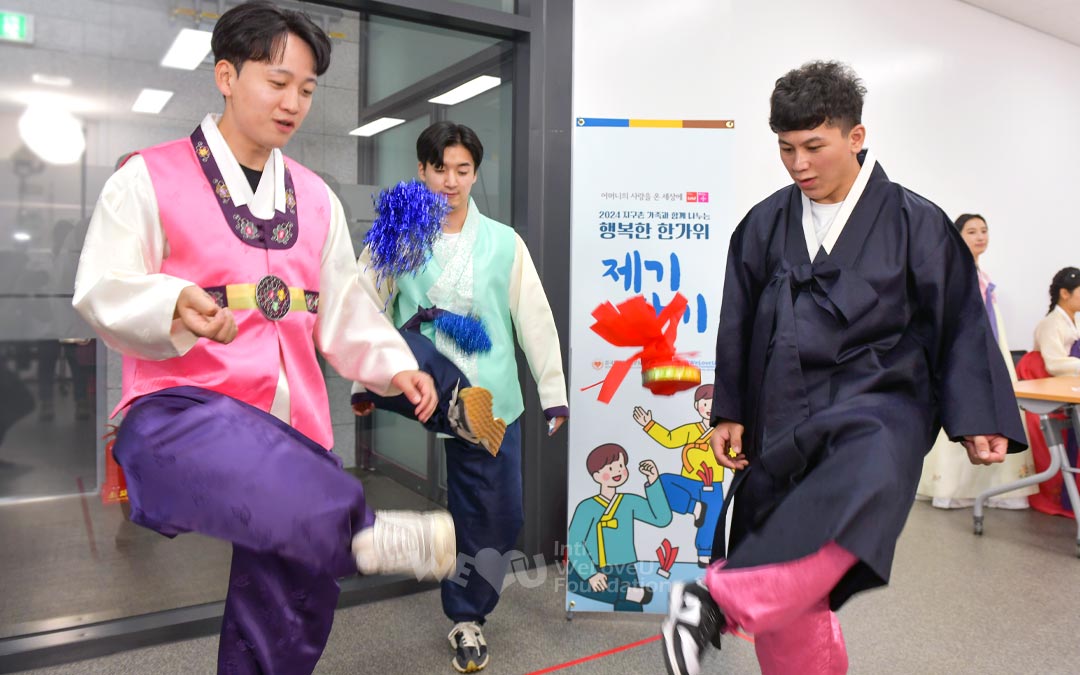 El Centro de Educación de WeLoveU estuvo lleno de actividad desde las primeras horas de la mañana cuando los miembros se pusieron el colorido hanbok en preparación para el evento. Los voluntarios colocaron los manteles con diligencia y organizaron materiales para el evento, asegurándose de que todo estuviera listo para los invitados. A las 11 a. m., los vecinos invitados comenzaron a llegar al lugar. Con sus rostros reflejando emoción, entraron con sus familiares, amigos y vecinos.