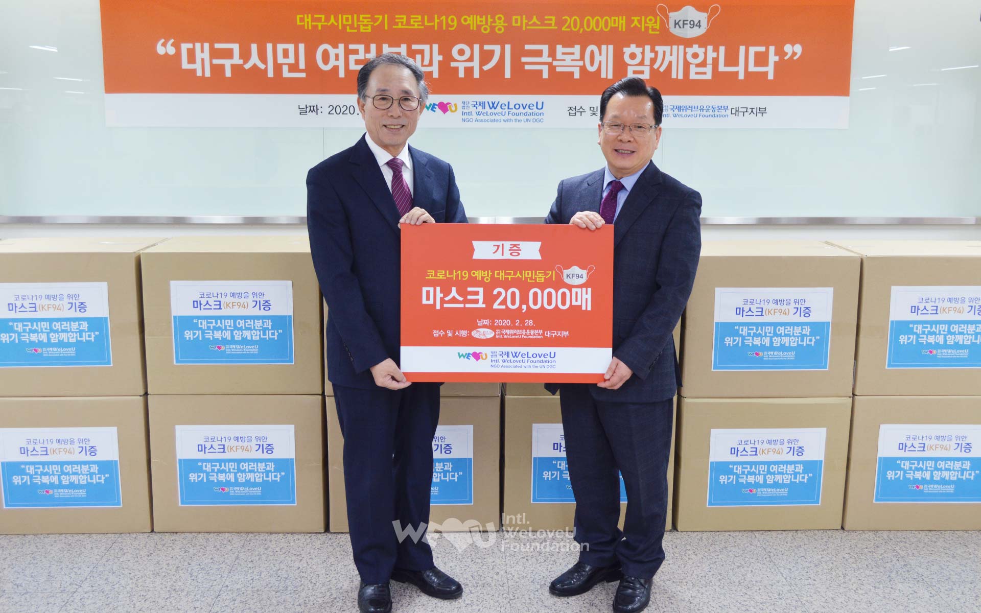 WeLoveU se propuso combatir la COVID-19 para evitar su propagación. El 28 de febrero, la Fundación Internacional WeLoveU donó 20 000 mascarillas higiénicas (KF94) a través de su sucursal en Daegu a los ciudadanos de esa ciudad, que se encontraban en un estado de confusión debido a la escasez de mascarillas. Especialmente en el momento en que se debe prestar atención a la prevención de la COVID-19 tanto física como psicológicamente, la sinceridad de los miembros de la fundación ha sido un gran apoyo para ellos.