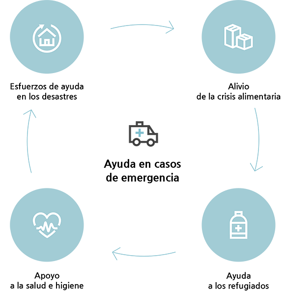 Un enorme desastre inesperado hace que la vida se derrumbe e incluso destruye la base social de una nación. Proporcionamos ayuda de emergencia a los refugiados cuyas vidas están amenazadas debido a las guerras civiles causadas por los problemas raciales, étnicos, religiosos y políticos, y a las víctimas que han perdido sus hogares y medios de vida debido a los desastres ambientales, terremotos y hambre.
