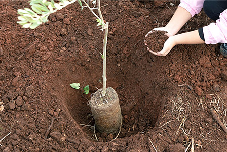 Plante la plántula (enderece las raíces y llene el hoyo mientras mezcla la capa superior y el subsuelo).