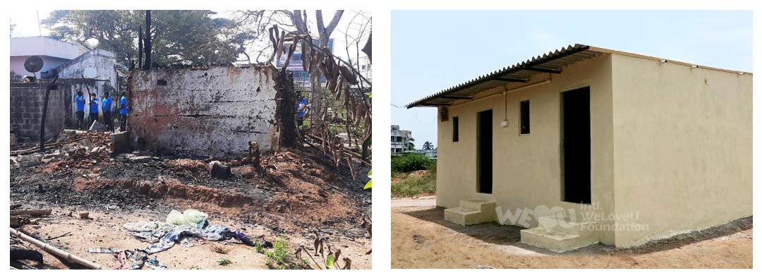 El sostén de la familia, de unos cincuenta años, quedó devastado tras el incendio. La familia pudo encontrar un lugar para dormir ya que sus vecinos les dieron una casa vacía, pero fue una solución temporal. Los hombros del cabeza de familia se sentían pesados. Los miembros de WeLoveU decidieron construir una nueva casa para darle esperanza a esta familia. Los miembros con habilidades de construcción donaron voluntariamente sus talentos.