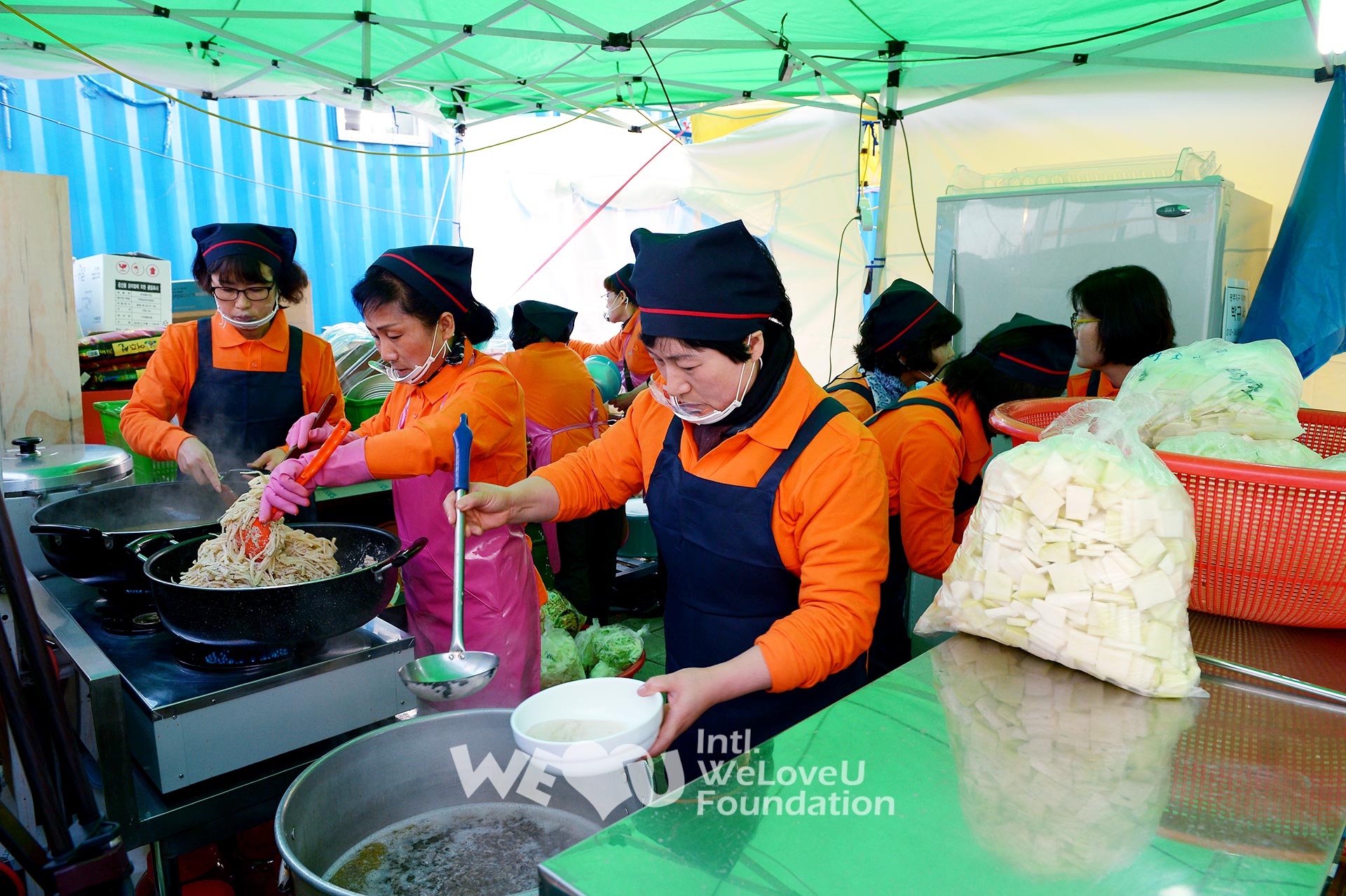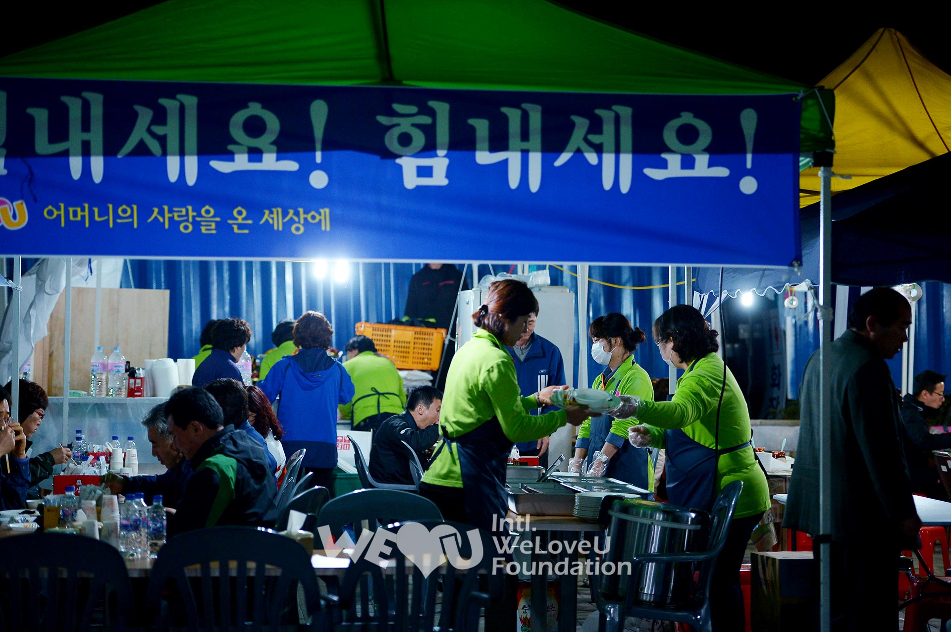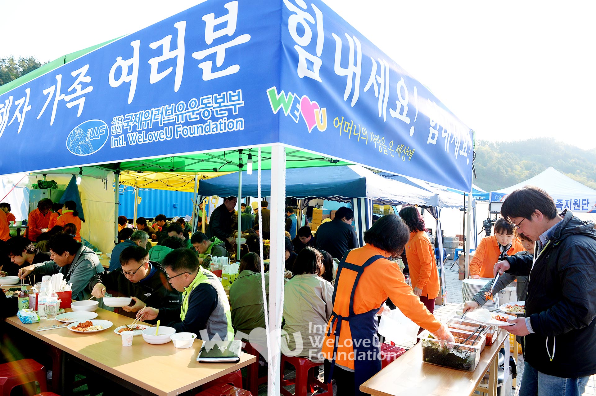With the faith that sorrow is halved when shared, the Intl. WeLoveU Foundation shared the grief of the victims’ families. The members from Gwangju and neighboring regions set up a free meal camp in front of the gymnasium, and began serving food to the victims’ families, other volunteers, rescue workers searching for the missing, and public workers dealing with the aftermath on April 21.