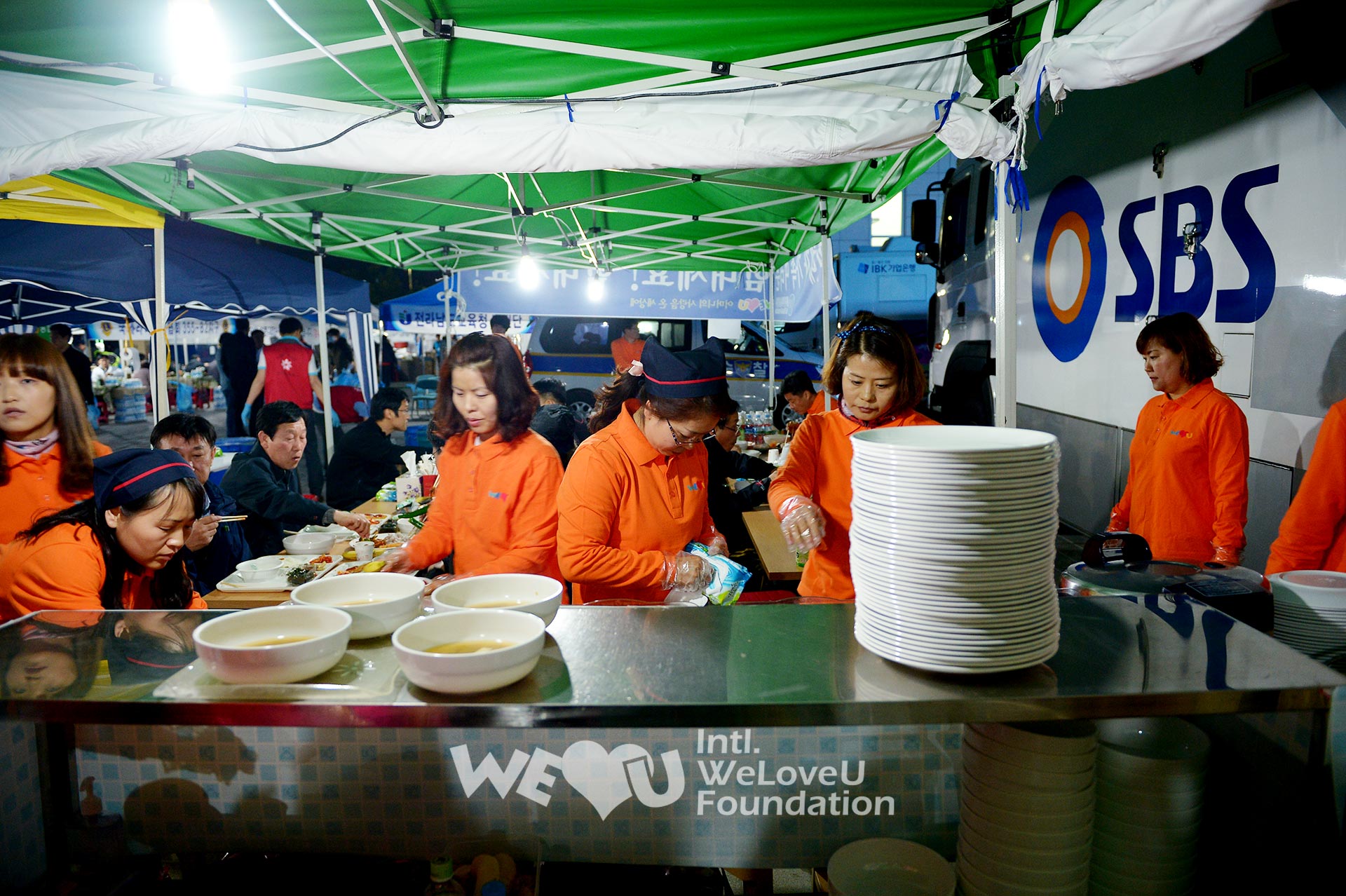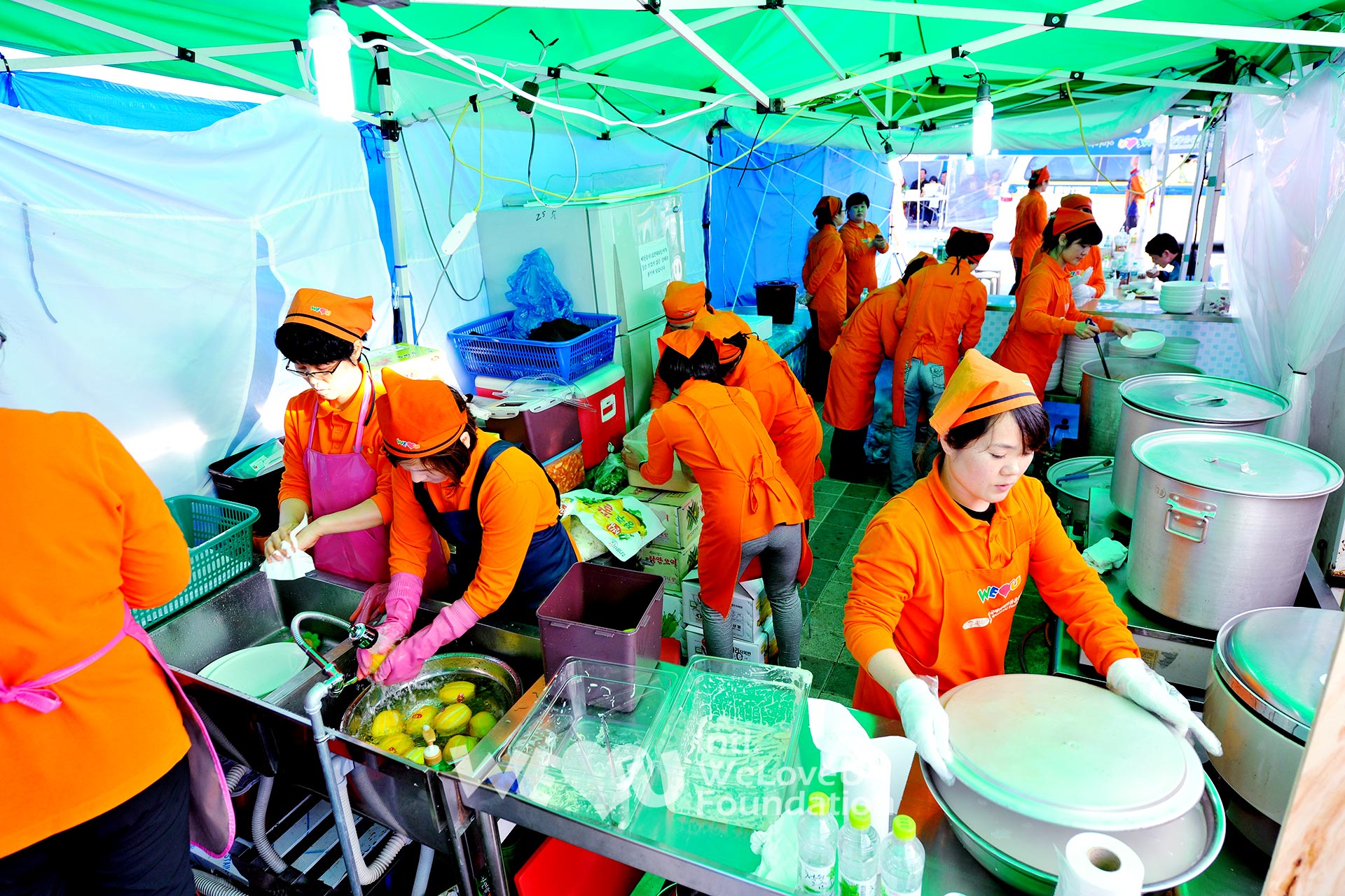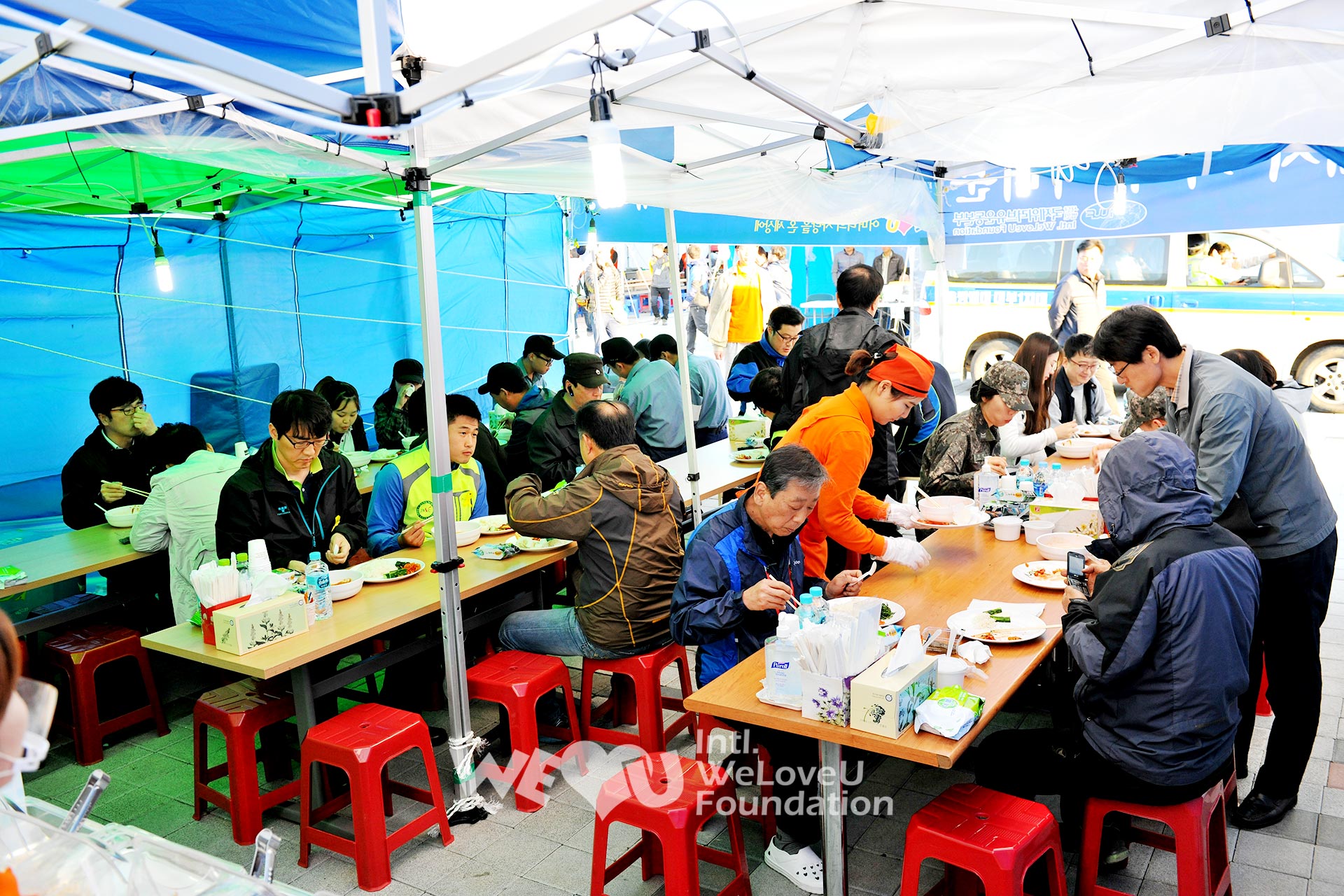 With the faith that sorrow is halved when shared, the Intl. WeLoveU Foundation shared the grief of the victims’ families. The members from Gwangju and neighboring regions set up a free meal camp in front of the gymnasium, and began serving food to the victims’ families, other volunteers, rescue workers searching for the missing, and public workers dealing with the aftermath on April 21.