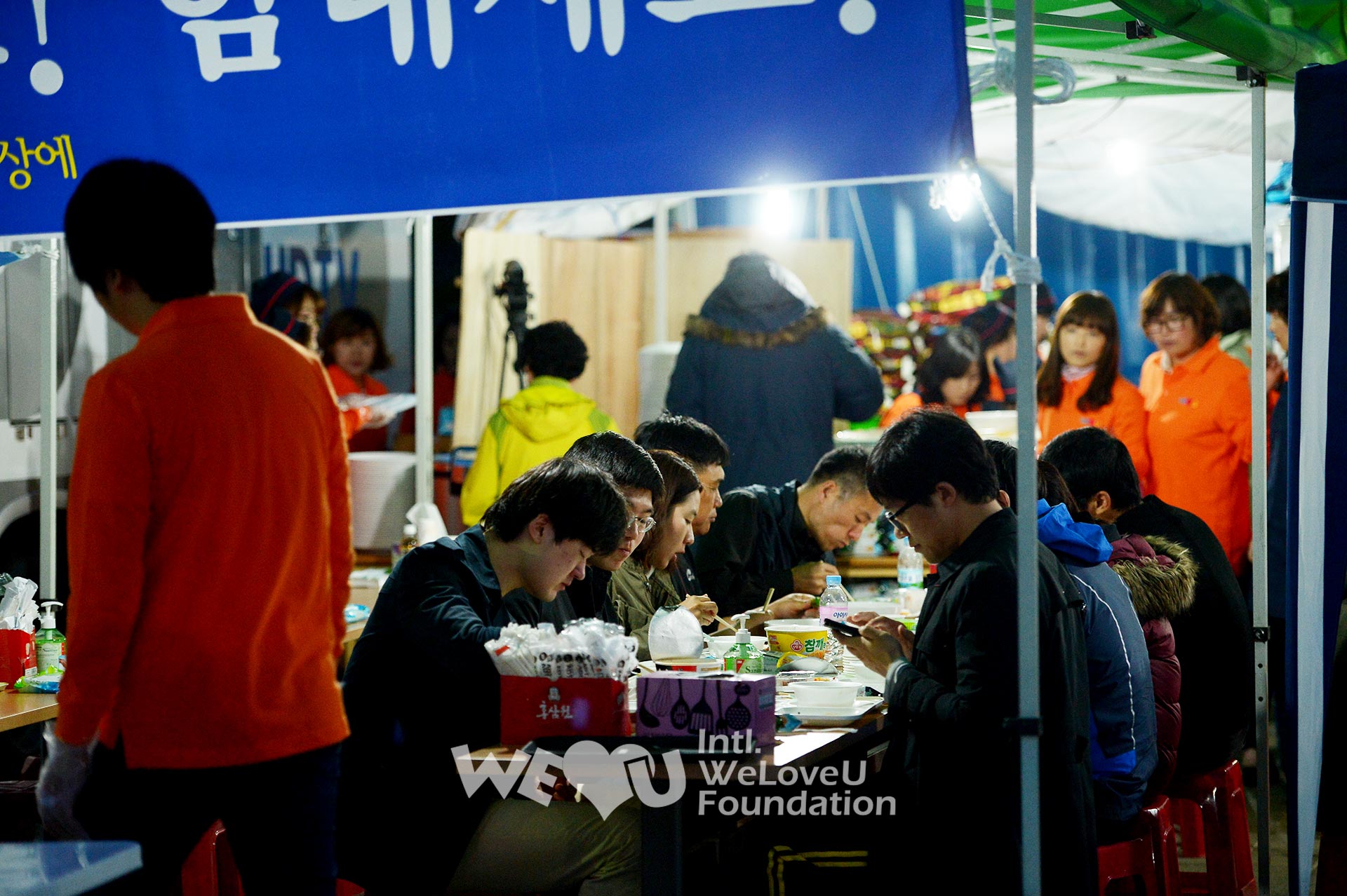 Even after serving evening meals, the members were still busy. They delivered heat packs to conscripted policemen standing guard duty in chilly weather, and served noodles to the victims’ families who came back to the gymnasium late at night after waiting for the victims’ return at the Paengmok Port. The light of the free meal camp of the Intl. WeLoveU Foundation was always turned on until the dawn.