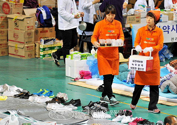 The victims’ families, who reluctantly came to have something to eat, encouraged by their relatives, regained some strength and opened their minds to the members gradually. An old couple, who came from Busan, said they had rarely eaten for twenty days because of their missing son. They expressed their thanks to the Foundation for giving them a warm reception enabling them to get strength. Some families saw the members cleaning the gymnasium and felt sorry and thanks at the same time, saying that good people were cleaning on their knees as if they were sinners because of them. “You all seem like mothers who have children to look after. But you’ve come here to help us. Being moved, I can’t hold back my tears,” said an old lady, holding a member’s hands. “I can feel that your volunteer service is very sincere,” “Thank you so much for your 24-hour service. We feel grateful and reassured,” some also said.