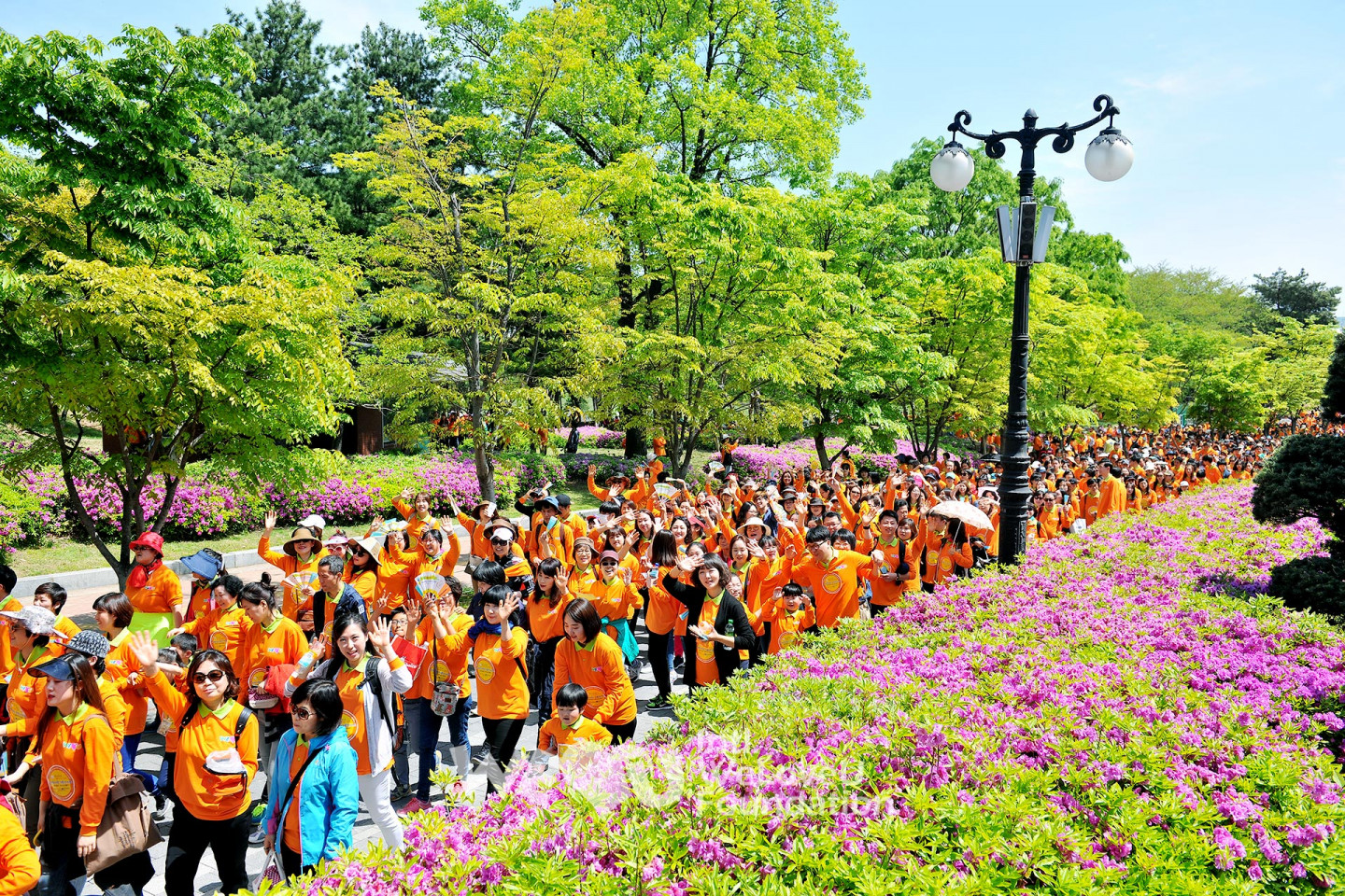 장길자 회장의 출발 선언과 함께 팡파르가 울리며 2부 걷기대회가 시작됐다. “좋은 마음 웃는 얼굴, 70억 인류에게 희망을!”이라고 구호를 외친 회원들은 한얼광장에서 출발하여 산책로를 따라 걸었다. 가족 사랑 표현하기, 소리 내어 웃기, 박수 치며 걷기, 희망의 종 치기, 신나는 율동 등 코스 중간중간 마련된 코너를 돌며 가족 사랑을 나눴다. 회원들의 가족적인 분위기가 좋았다는 장수빈(노원구) 회원은 “얼마 전에 일본과 에콰도르에서 지진이 나 무척 안타까웠다. 걷기대회를 통해 조금이나마 도움이 될 수 있다니 감사하다. 비록 힘든 상황이지만, 먼 나라에서도 돕고 싶어 하고 힘내라고 응원하는 사람들이 있다는 것을 잊지 말고 항상 희망을 품고 살아가셨으면 한다”고 말했다.