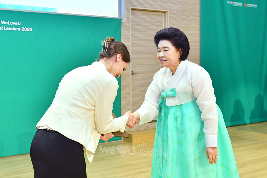 7월 12일 오전 9시경, 국제위러브유 성남판교지부 세미나실에서 ‘2023 국제위러브유 대학생 환경리더 위촉식’이 열렸다. 이 행사에는 장길자 명예회장, 이강민 이사장 등 위러브유 관계자들과 국내외 대학생 약 500명이 참석했다.