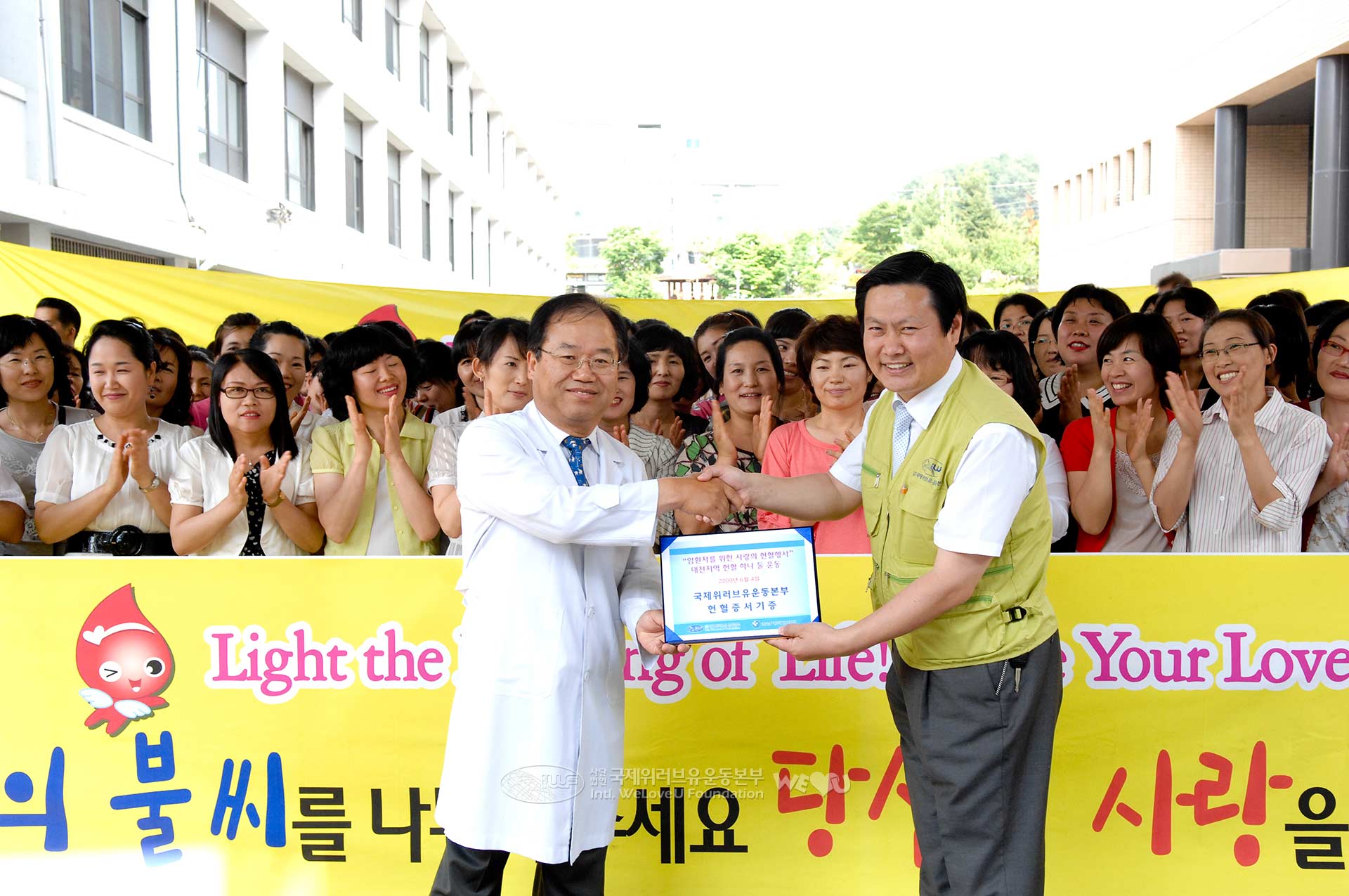 국제위러브유운동본부는 6월 4일 충남대학교병원 소아병동 앞에서 ‘암환자를 위한 헌혈 하나둘 운동’을 실시했다. 국제위러브유운동본부와 충남대학교병원 대전지역암센터가 공동 주최한 이 행사는 대전지역 위러브유 회원 500여 명이 참가하여 성황리에 치러졌다.