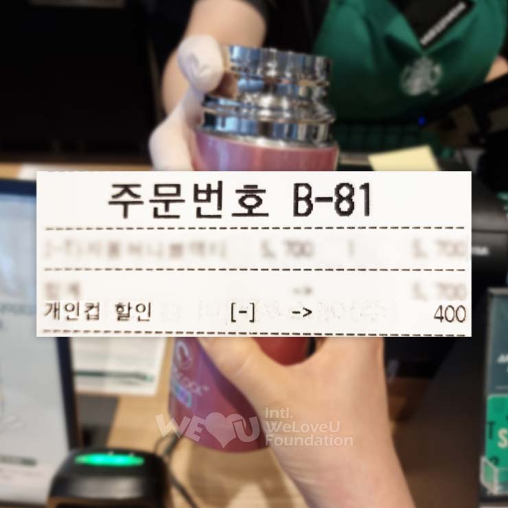 이모들과 함께 카페에 갔습니다. 용기(텀블러)를 내는 게 처음에는 어색했는데 막상 하니 환경을 위했다는 생각에 기뻤습니다. 음료를 마시다가 영수증을 우연히 봤는데, 용기 사용으로 할인도 됐더라고요! 계속 텀블러를 가지고 다니겠습니다.