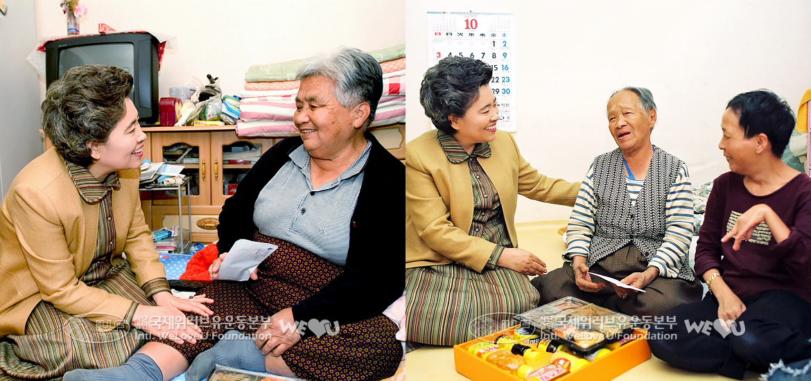 위안잔치를 마치고 할머니들을 배웅한 다음 장길자 회장님 일행은 몸이 불편해서 잔치에 참석하지 못한 할머니들의 가정을 직접 방문하여 별도로 싸둔 잔치음식과 선물세트를 드리고, 겨울철 난방비와 의료비에 쓰시도록 성금을 전달해 드렸습니다.