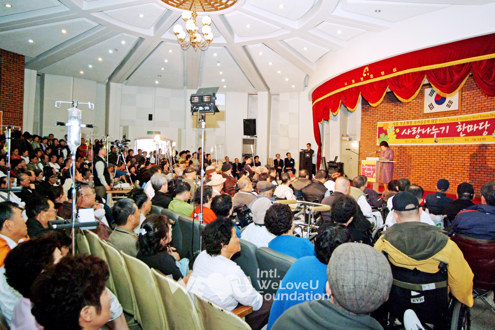 행사 첫머리에 회장님께서는 “국가유공자 여러분의 숭고한 희생에 감사와 위로를 전하고자 작은 위안의 자리를 마련했다”고 인사하시면서, 나라를 위해 희생하신 분들이 그간 겪었을 고통을 생각하며 목이 메어 채 말씀을 잇지 못하셨습니다. 잠시 후 회장님은 “이제는 국가와 국민들이 여러분을 위해 드리고 도울 때”라고 강조하시며 “하루하루 즐겁고 기쁘게 지내시면 어떤 병이라도 다 떨쳐낼 수 있을 것”이라고 환자와 가족들을 격려하셨습니다.