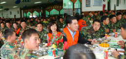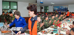 어느덧 점심시간이 되자 회원들은 부대 내 대식당에서 준비해 간 치킨과 떡, 과일, 음료수 등을 장병들에게 대접했습니다. 식사 전, 여단장님이 새생명복지회를 소개하자 500여 명의 장병들은 일제히 뜨거운 환영의 박수를 보냈습니다. 회장님은 어제 막 ‘천리행군’이라는 고된 훈련을 마치고 돌아온 장병들을 비롯해 연일 여러 가지 힘든 훈련으로 단련된 장병들에게“여러분들이 계셔서 국민들은 편안히 잠자리에 들고 생업에 종사한다”고 위로하시며“더 좋은 선물을 많이 드려야 하겠지만 회원들이 무엇보다 따뜻한 마음을 담아 왔으니 받아 달라”고 하셨습니다. 음식과 함께 이날 부대로 전달된 위문품은 장병들이 따뜻한 겨울, 시원한 여름을 보내길 바라는 의미에서 준비한 냉온풍기 3대였습니다.