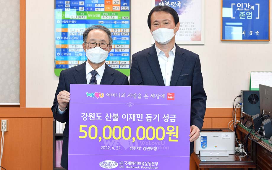 4월 27일, 사단법인 국제위러브유운동본부가 동해안 산불로 피해를 입은 이웃들을 돕기 위한 성금 5천만 원을 강원도청 측에 전달했다. 삼척·강릉·동해시에서는 지난 3월 일어난 산불로 540여 억 원의 재산 피해가 나고 120명의 이재민이 발생했다.