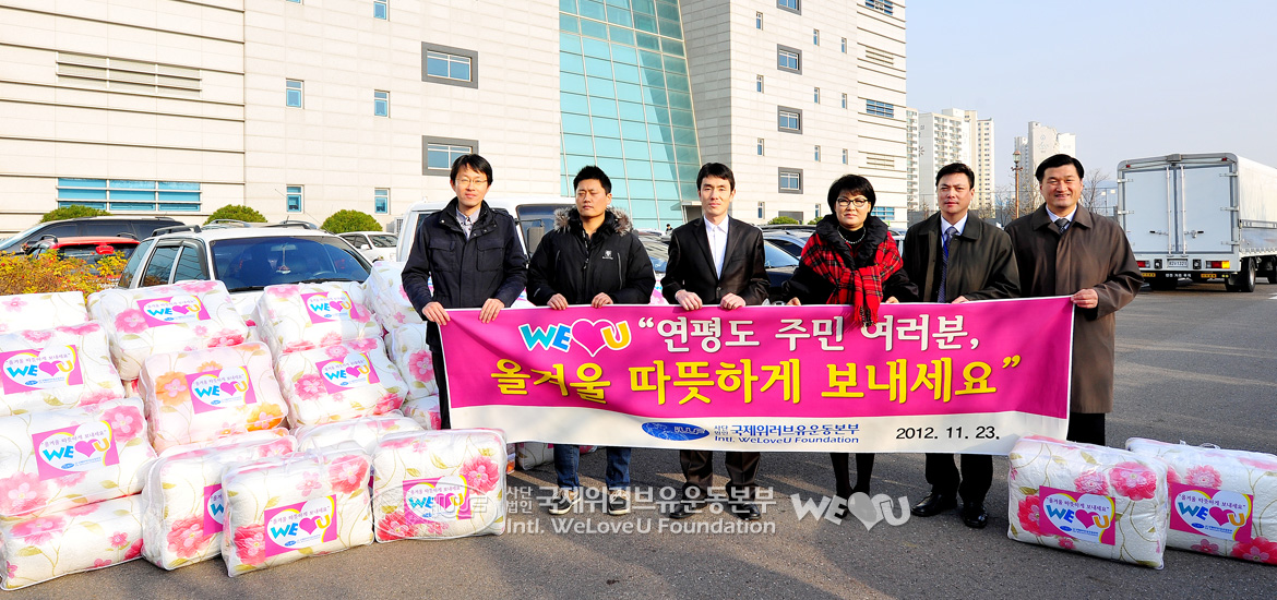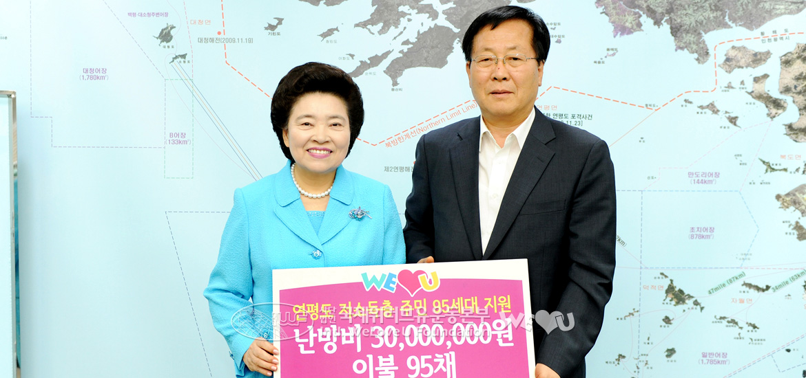 6.25 전쟁 62주년을 맞은 6월 25일, 오후 3시 20분경 국제위러브유운동본부의 ‘연평도 저소득층 주민 95세대 지원 기금 및 물품 전달식’이 인천광역시 옹진군청에서 열렸다. 이 전달식에는 위러브유 장길자 회장과 이사진, 조윤길 옹진군수 및 관계 공무원들이 참석했다.