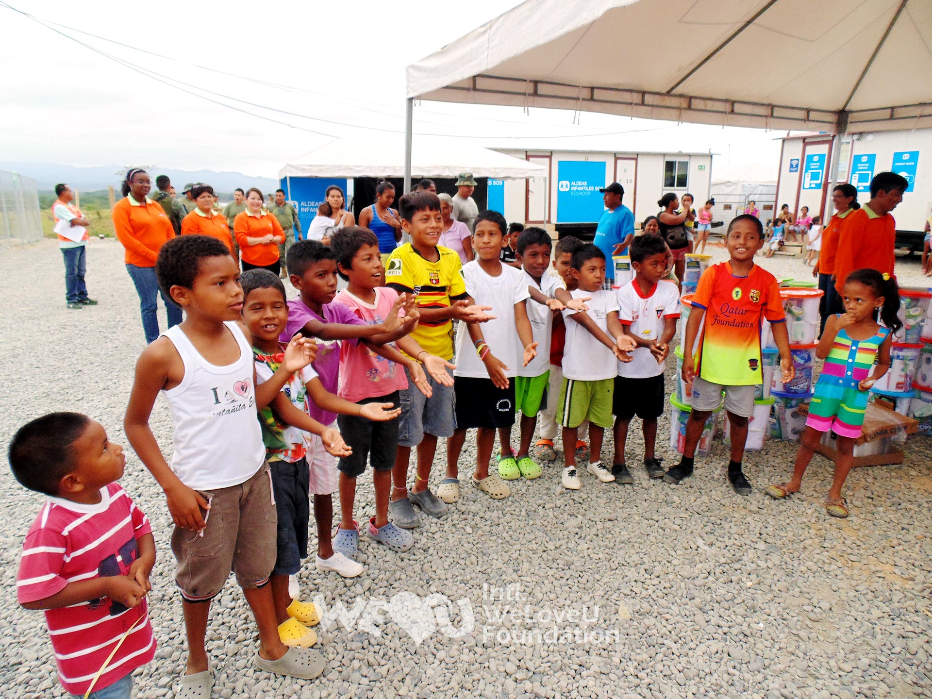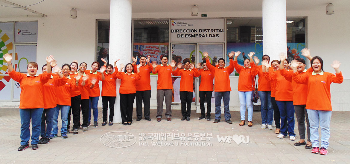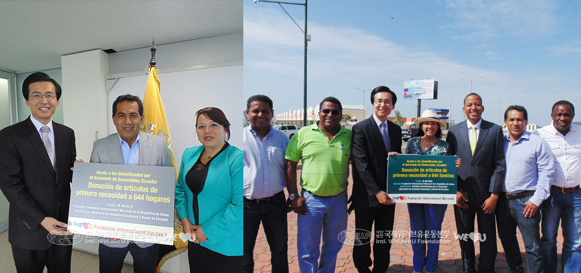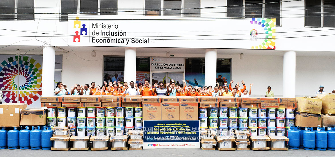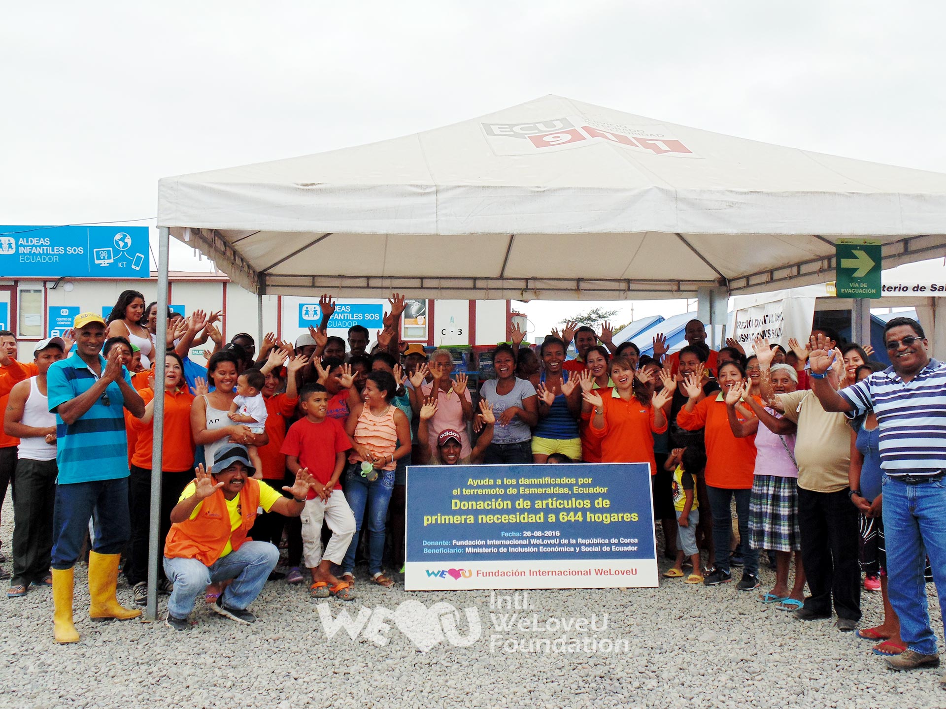 8월 26일, 에콰도르 키토 지부 회원들과 정부 관계자 50여 명이 참석한 가운데 에스메랄다스시에 있는 에스메랄다스주 사회경제통합부 지역본부 건물에서 구호물품 전달식이 진행됐다. 위러브유는 에스메랄다스주 차망가, 무이스네, 포르테테 등 7개 지역 임시 천막촌 9개소에 가스레인지, 가스통, 대형 솥, 냄비 등 조리 시설과 도구를 지원하고 이곳에 거주 중인 644세대에 생필품 세트와 말라리아, 뎅기열, 지카 바이러스 예방을 위한 모기장을 기증했다. 현장에 함께한 미겔 알라르콘(Miguel Alarcon) 사회경제통합부 지역관리본부장은 “물심양면으로 인도주의적 도움을 아끼지 않은 위러브유에 감사한다. 기증받은 구호물품은 이재민 가정에 잘 전달하겠다”고 밝혔다.