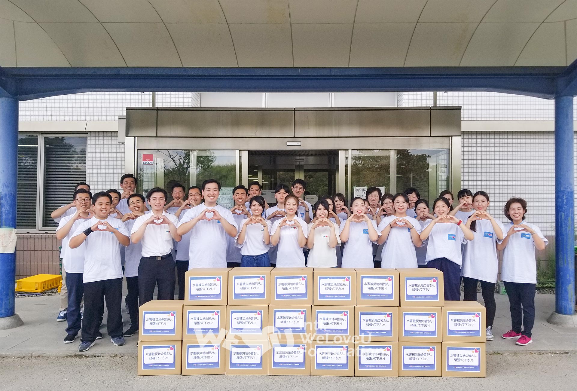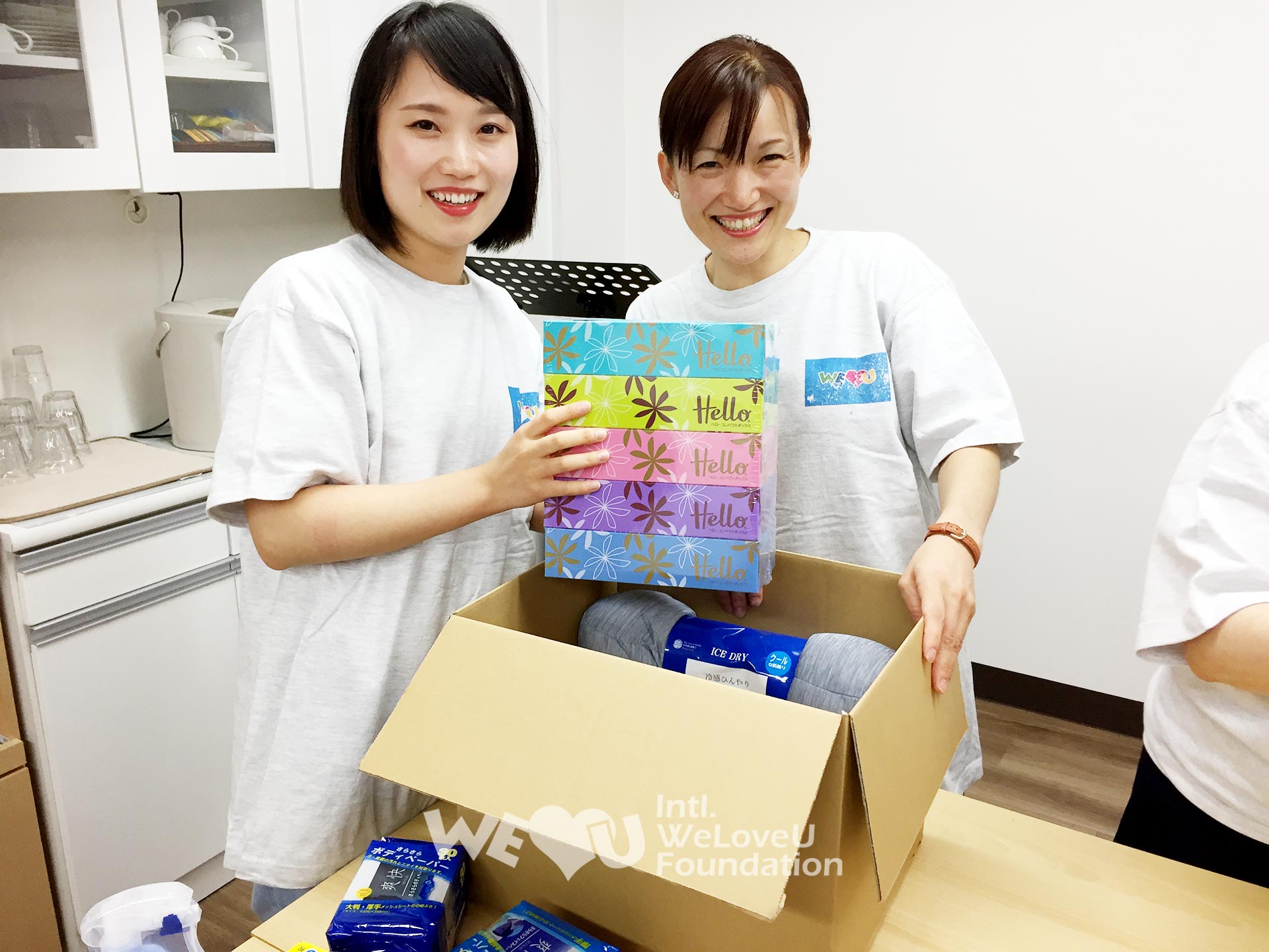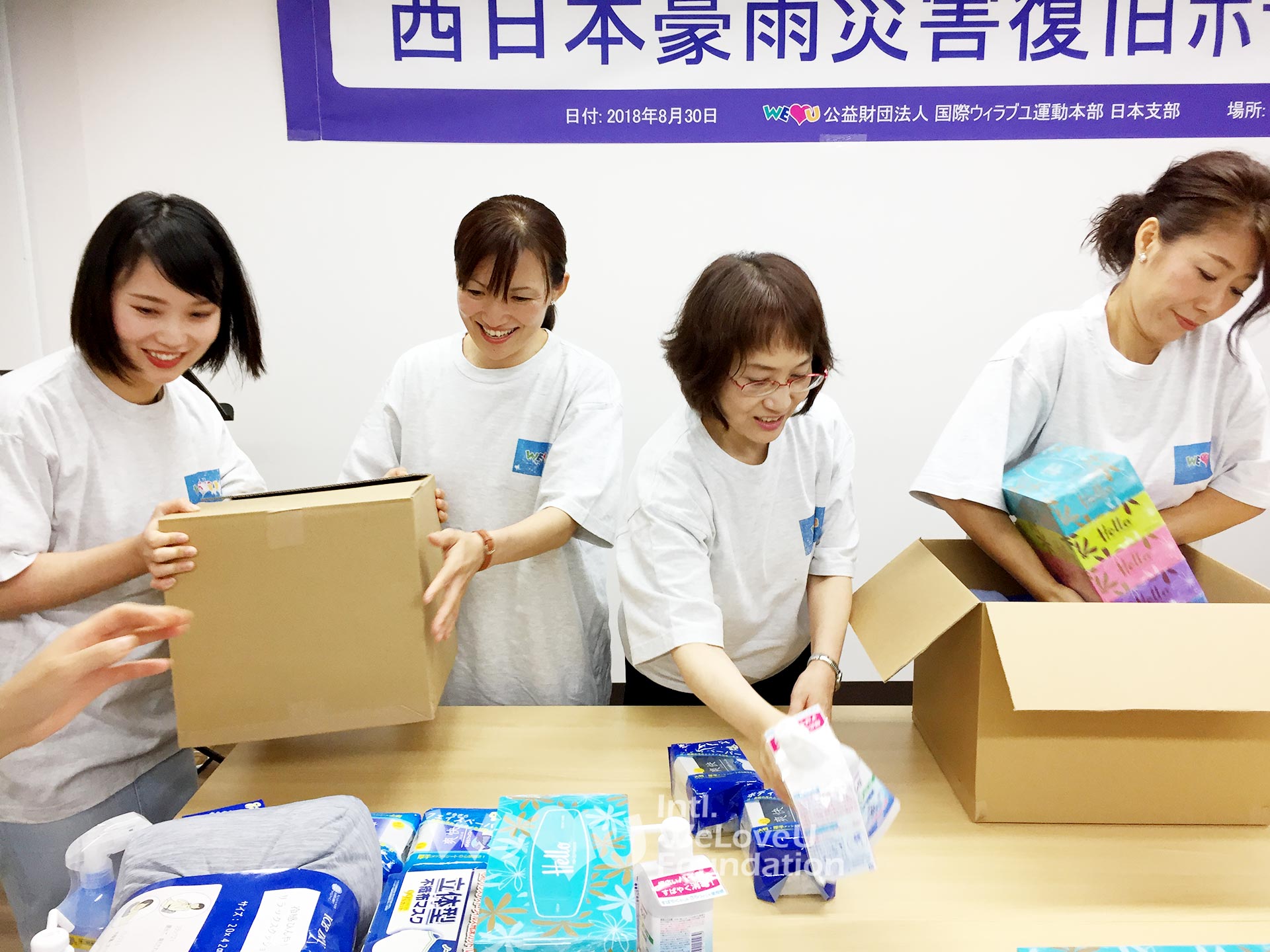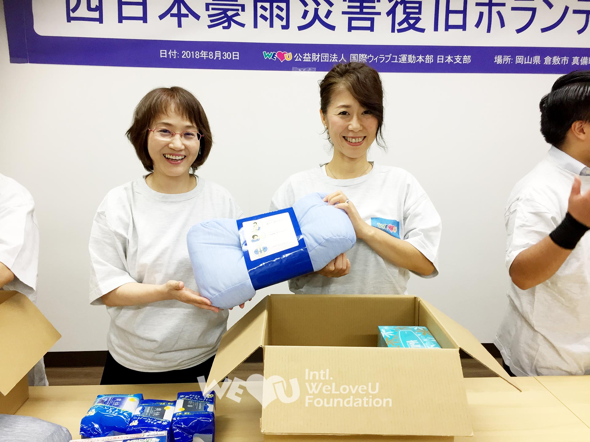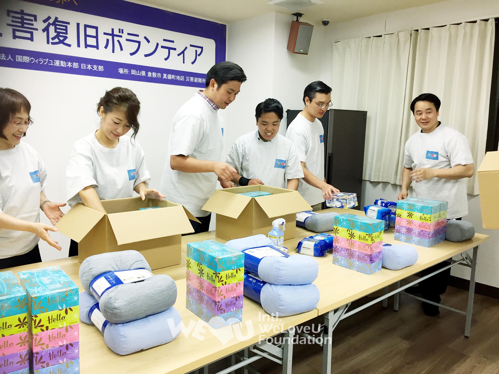 (재)국제위러브유는 최대 피해지인 구라시키시 마비 마을의 이재민들을 돕고자 현장으로 달려갔다. 구라시키시는 주택 4600여 채가 물에 잠겼고 복구 작업도 두 달이 넘어가지만 지지부진한 상태였다. 8월 30일 도쿄, 후쿠오카, 삿포로, 사이타마 지역의 위러브유 회원 65명이 모여 이재민의 건강과 위생을 위해 대피소 곳곳(화장실, 계단, 바닥, 형광등 등)을 청소하고, 이재민에게 필요한 물품(물티슈, 소독용 알코올, 기능성 베개, 휴지 등)을 지원했다. 뿐만 아니라 위러브유 회원들은 재해로 인해 상심이 큰 이재민들을 만나 위로하고, “국가적 재난에 온 국민이 마음을 모으고 있으니 힘내라”고 격려했다.