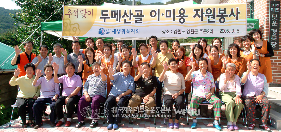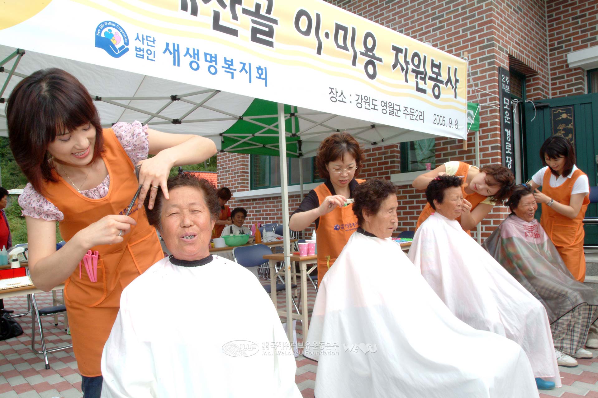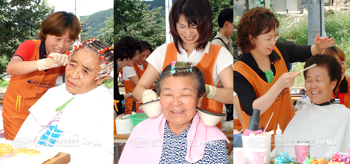 이 때문에 어르신들이 머리 손질을 한 번 하시려면 비용도 문제에다 하루 서너 차례 다니는 버스로 읍까지 나가서 꼬박 하루가 걸린다는 소식에 새생명복지회에서는 추석을 앞두고 주문마을을 찾게 되었습니다. 경력이 10여 년씩 되는 미용 전문가 회원 10명을 포함, 약 20명의 회원들은 9월 8일, 질 좋은 파마 약과 갖가지 미용기구를 챙겨 이른 새벽부터 집을 나섰습니다.