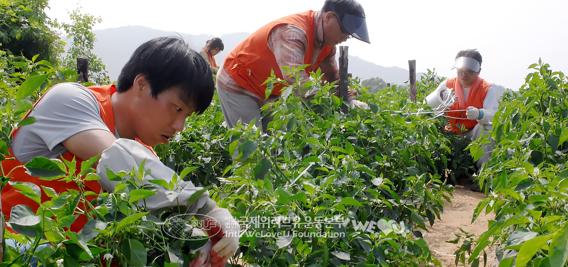 회원들의 할 일은 고추밭과 들깨밭에서 잡초를 뽑고, 고추에는 줄을 매고 농약을 주는 것입니다. 먼저 고추밭에 들어서자 모두 놀랄 수밖에 없었습니다. 할머니 외에 돌볼 이가 없는 밭은 한 달이 넘도록 손길이 가지 않자 잡초가 고추보다 더 높이, 무성하게 자라 고랑조차 보이지 않을 정도였습니다. 고추마저 손쓸 겨를 없이 일찍 찾아온 비바람에 다 뉘어져 힘을 잃고 떨어진 것들이 수두룩했습니다. 회원들은 장갑을 바짝 끼고 준비해 온 호미로 김을 매기 시작했습니다.