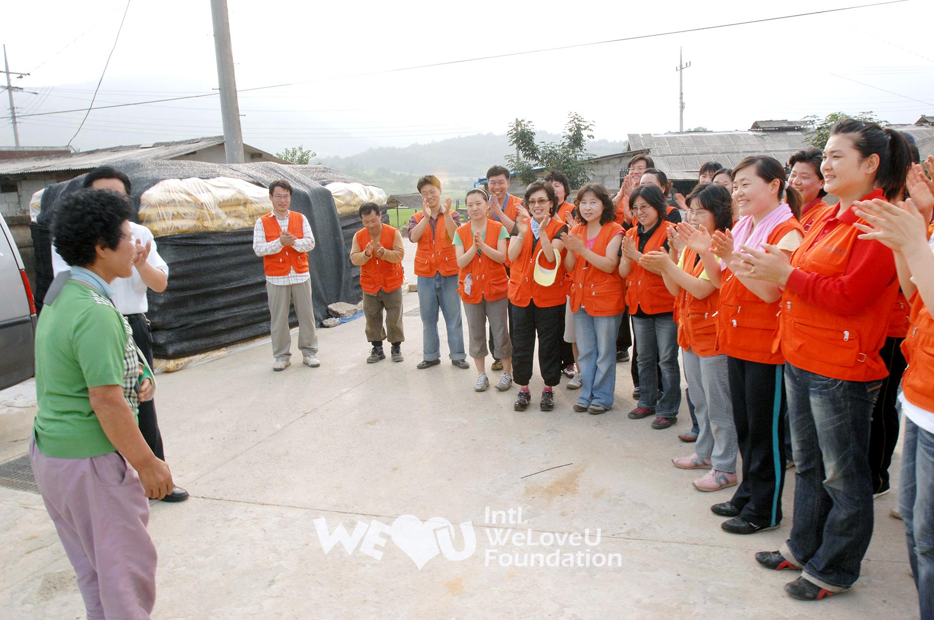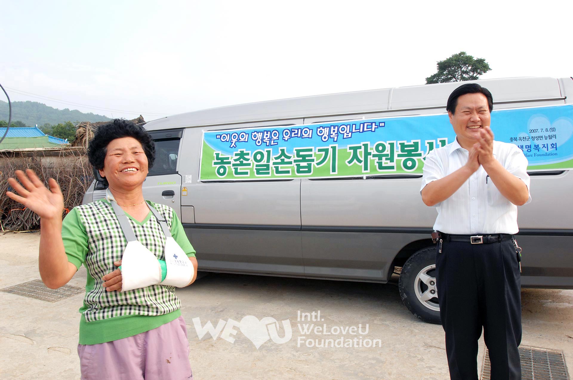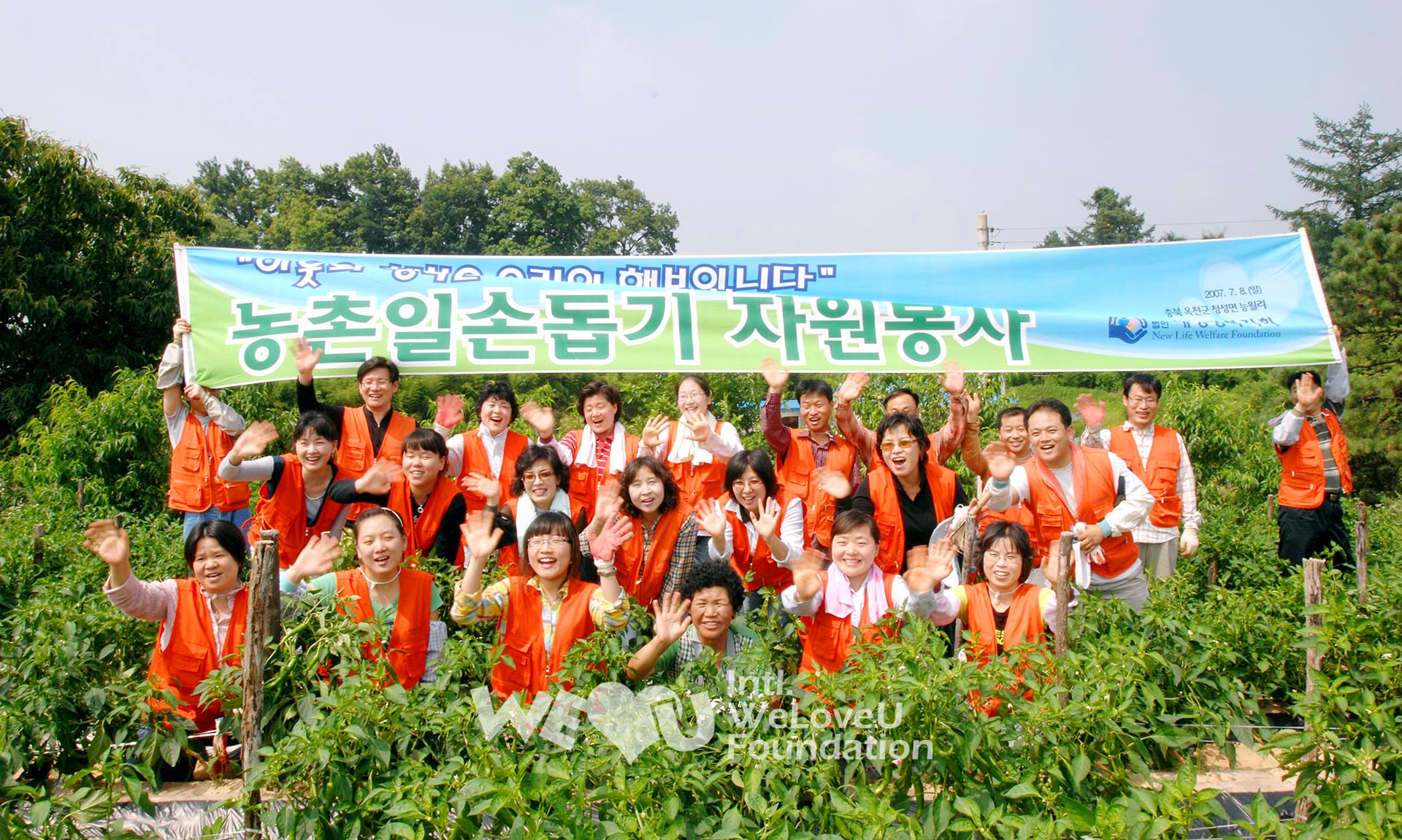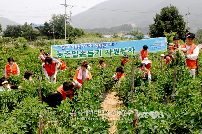 7월 8일 10시, 시원한 매미 울음소리가 사방의 녹음을 더 푸르게 만드는 충북 옥천군 청성면 능월리의 두릉마을. 조용한 이 마을에 활기가 감돌기 시작했습니다. 20여 명의 새생명복지회 회원들이 혼자 사시는 이영자(63) 할머니의 밭일을 거들어 드리기 위해 찾아왔기 때문입니다. 할머니는 약 1만 평방미터(3천 평가량)에 다다르는 넓은 논밭을 혼자 일궈오셨습니다. 그러던 한 달 전, 이웃의 과수원에 열매 솎는 일을 돕다가 그만 사다리에서 떨어져 팔을 다치셨고 이후로는 농사일을 돌볼 수가 없게 되었습니다.