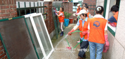 회원들은 흙탕물로 더러워진 살림살이들을 깨끗이 씻어내듯, 수재민들의 마음에 드리워진 슬픔과 고통의 얼룩도 속히 지워지길 바라며 오후 4시경까지 봉사를 이어갔습니다. 이날의 봉사는 일할 사람이 없어 복구가 지연되었던 인근 경로당의 내부와 유리창을 깨끗이 닦는 것으로 마쳐졌습니다.
