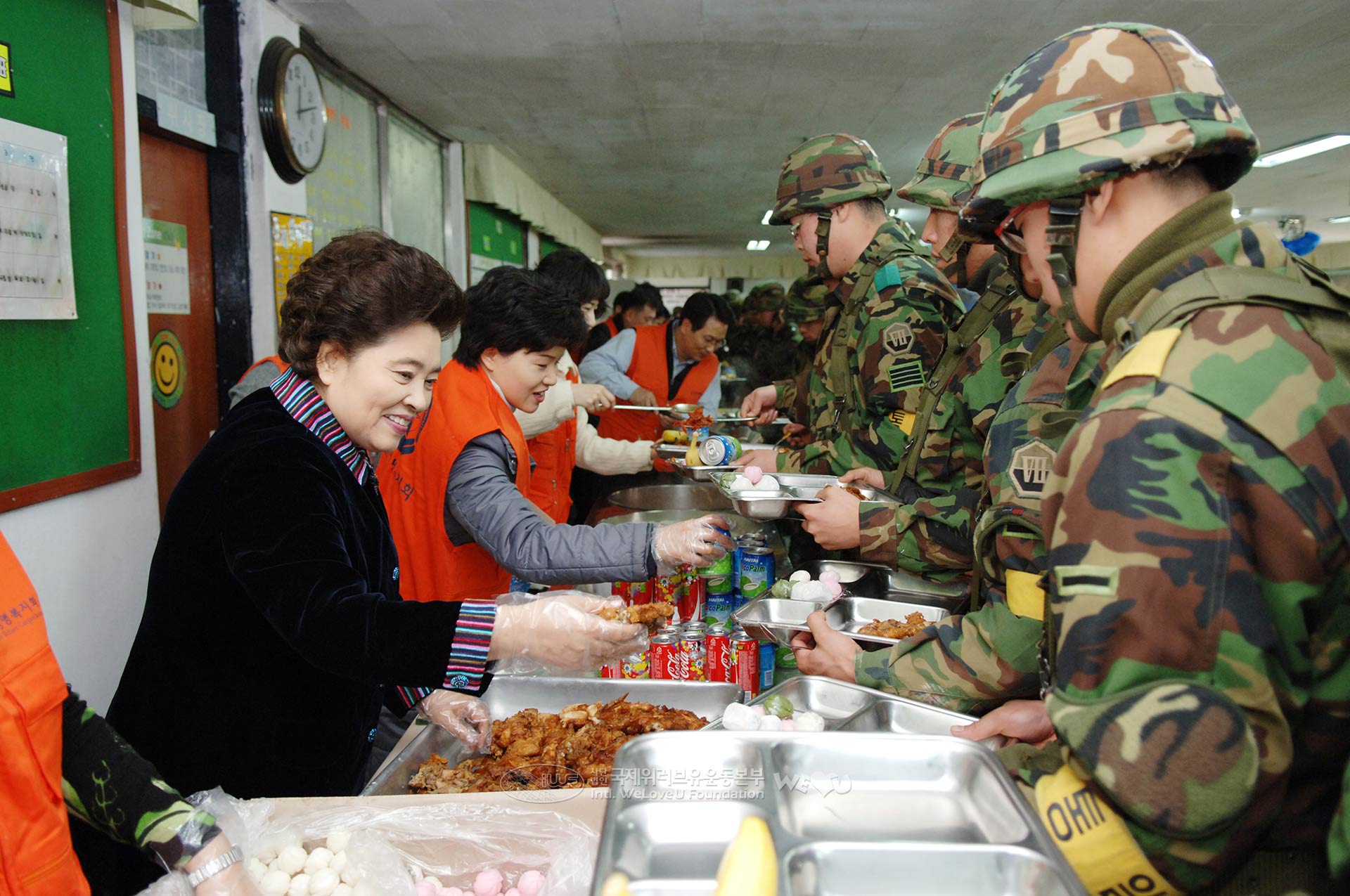 견학을 마치고 장길자 회장님과 회원들은 부대 내 식당 세 곳에서 배식 봉사를 시작했습니다. 군대 간 아들을 염려하는 어머니의 마음으로 정성스럽게 준비한 떡과 닭고기, 과일, 음료수 등 음식에 풍성한 식탁이 차려졌습니다. 맛있게 먹는 장병들의 모습에 회원들의 마음도 풍성해진 시간이었습니다.