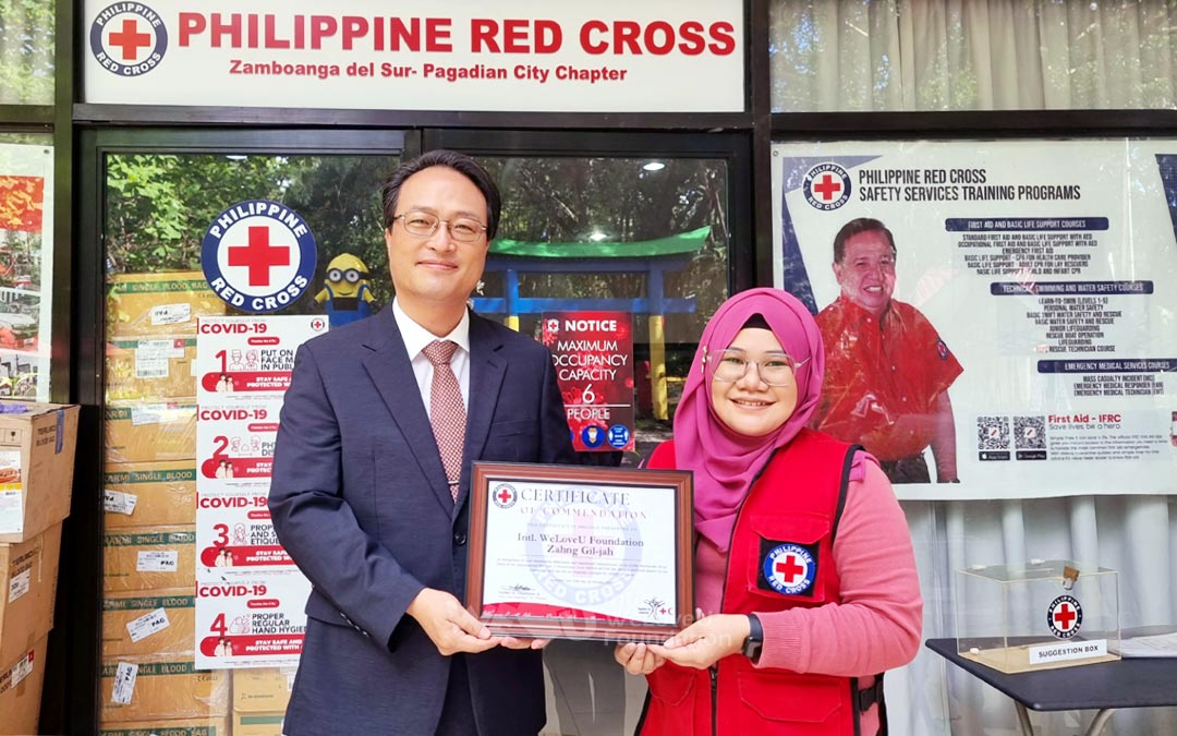 필리핀적십자사 남삼보앙가 파가디안지사는 위러브유 장길자 명예회장의 헌혈 증진 공로와 헌신을 기리며 표창장을 수여했습니다.