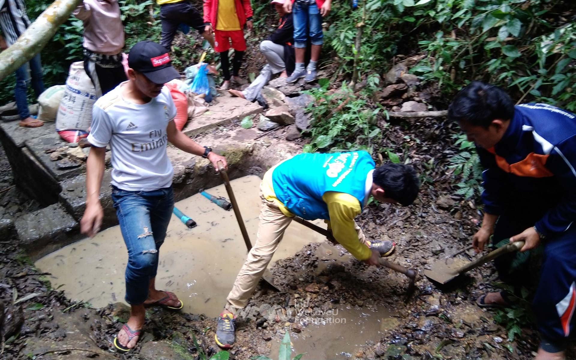 On the 27th, sixteen members departed from Vientiane to the school. After arriving at the school, they headed to the water source in the afternoon of the 28th. After investigating the route for the water pipes, they built a temporary dam to repair the water source, and connected pipes from the dam to the school. This work took three full days. Meanwhile, at the school, the existing facilities were renovated; the members repaired the run-down girls’ dormitory and restroom, and teachers’ dormitory as well. They also cleaned the water tank and made a cover to block out sunlight and dust