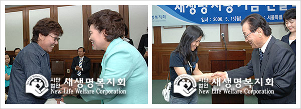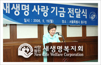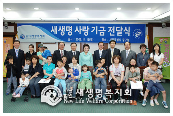 At 6 p.m. on May 15, 2006, the “New Life Fund Donation Ceremony” was held at the Jung-gu ward office in Seoul. The fund was raised by the love and devotion of 10,000 members who had participated in the 8th New Life Family Walkathon. The reason that the New Life Fund Donation Ceremony was held at the Jung-gu ward office was because the New Life Welfare Foundation hosted the walkathon in Namsan Park which is part of Jung-gu ward. As the foundation showed its will to help children suffering from diseases, the ward office worked with the regional public health center to select beneficiaries. The fund will be delivered to more neighbors in more regions in the near future.