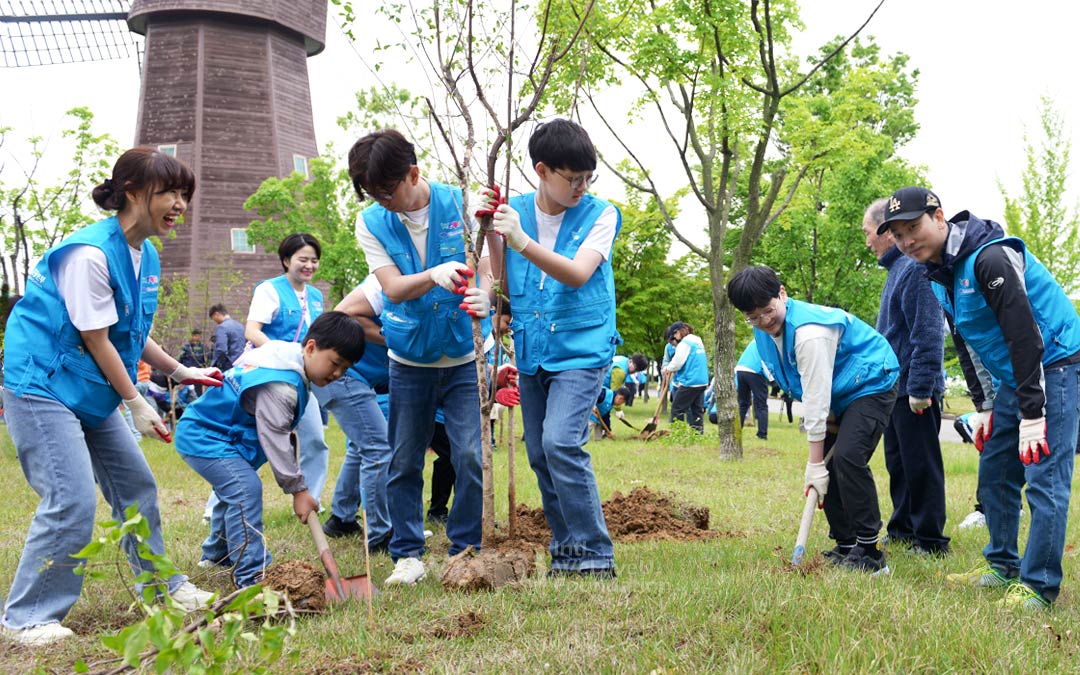 On the same day, at Dongnak Park in Gumi, over 300 WeLoveU members and their families gathered to plant 150 cornelian cherry trees. Due to the soil being softened by the rain the previous day, making it easier for the children’s inexperienced shoveling, the ground was well-dug.